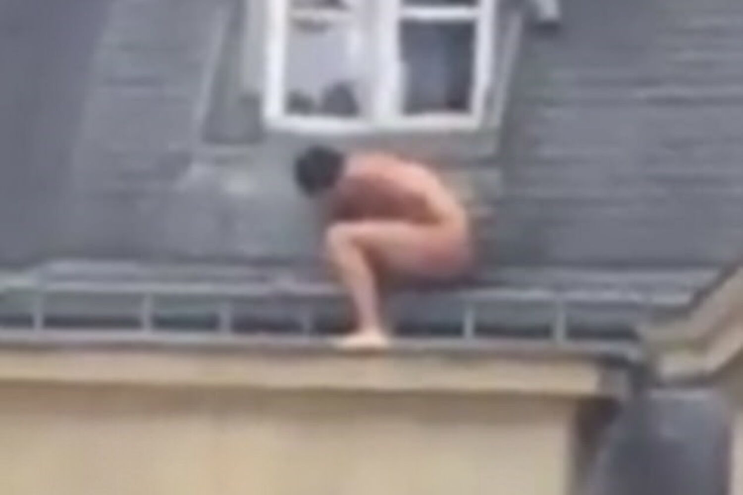 No vídeo, o homem surge visivelmente encolhido. Não se sabe ao certo quanto tempo terá ficado no telhado do edifício.