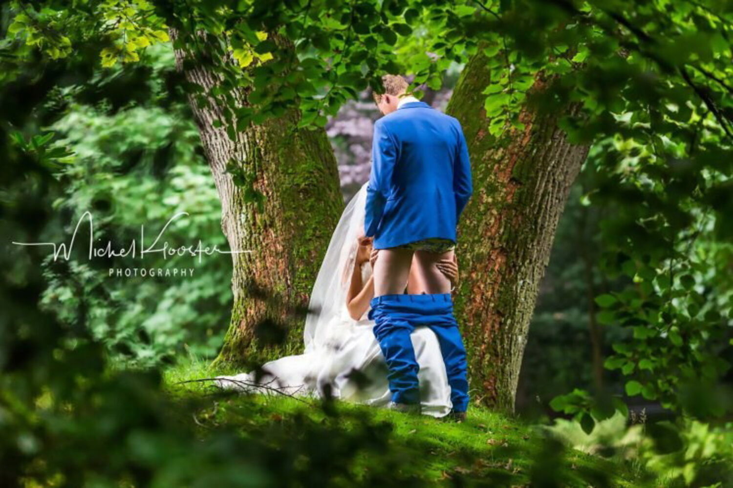 A polémica fotografia, captada pelo fotógrafo Michel Klooster, mostra o noivo com as calças em baixo, enquanto a noiva parece estar a fazer-lhe sexo oral na floresta. "Alguns recém-casados nem conseguem esperar que a festa acabe para recolherem à suite para uma noite de núpcias espetacular. Felizmente estes já tinham trocado votos e já estavam oficialmente casados", escreveu o fotógrafo nas redes sociais.