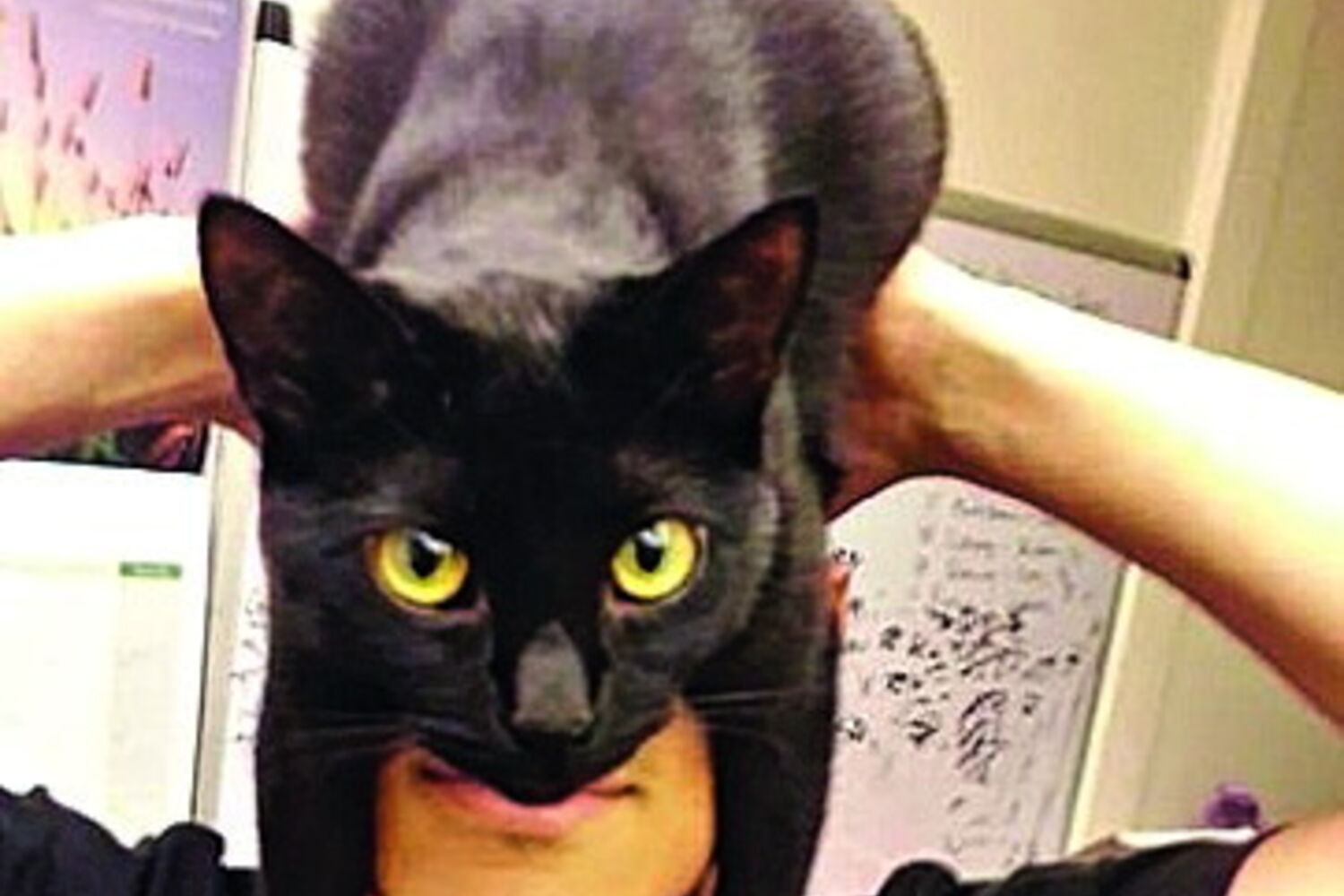 É a nova mania do momento nas redes sociais: tirar fotos com gatos na cabeça como se fossem... chapéus.