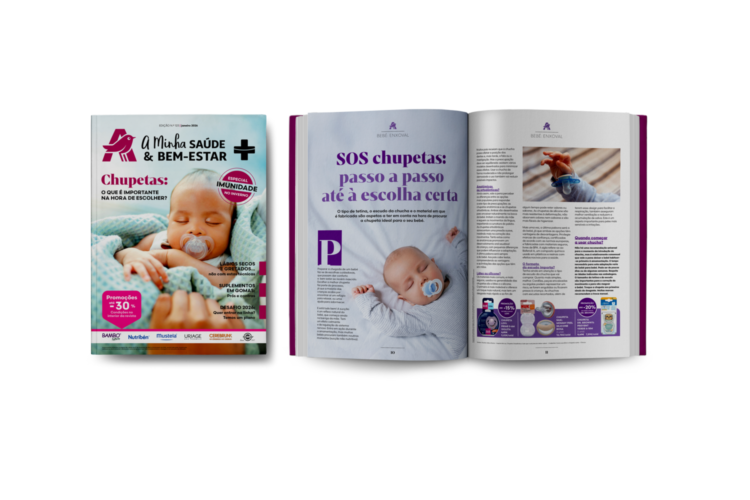 Até o tipo de pele do bebé é relevante. As peles sensíveis são menos tolerantes à baba que pode acumular-se sob o escudo. Se for o caso, é preferível optar por uma chucha com escudo recortado. Pode aprofundar estas e outras dicas para guiar a escolha da primeira chucha do bebé na Minha Saúde & Bem-estar da Auchan de janeiro. Os bebés dão mote a outros temas detalhados nesta edição da revista distribuída gratuitamente nas lojas da marca e online. Descubra quando é que os suplementos alimentares podem fazer falta nos primeiros anos de vida e encontre respostas para algumas das dúvidas mais frequentes sobre amamentação e cuidados com a pele do bebé.