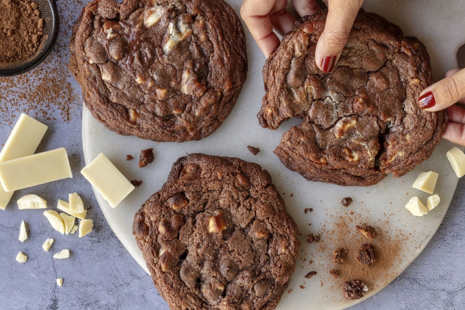 11. Deixe as bolachas arrefecer no tabuleiro por 5 minutos antes de servir. Para um interior cremoso, sirva-as ainda mornas. Se preferir um recheio mais firme, deixe-as arrefecer completamente.