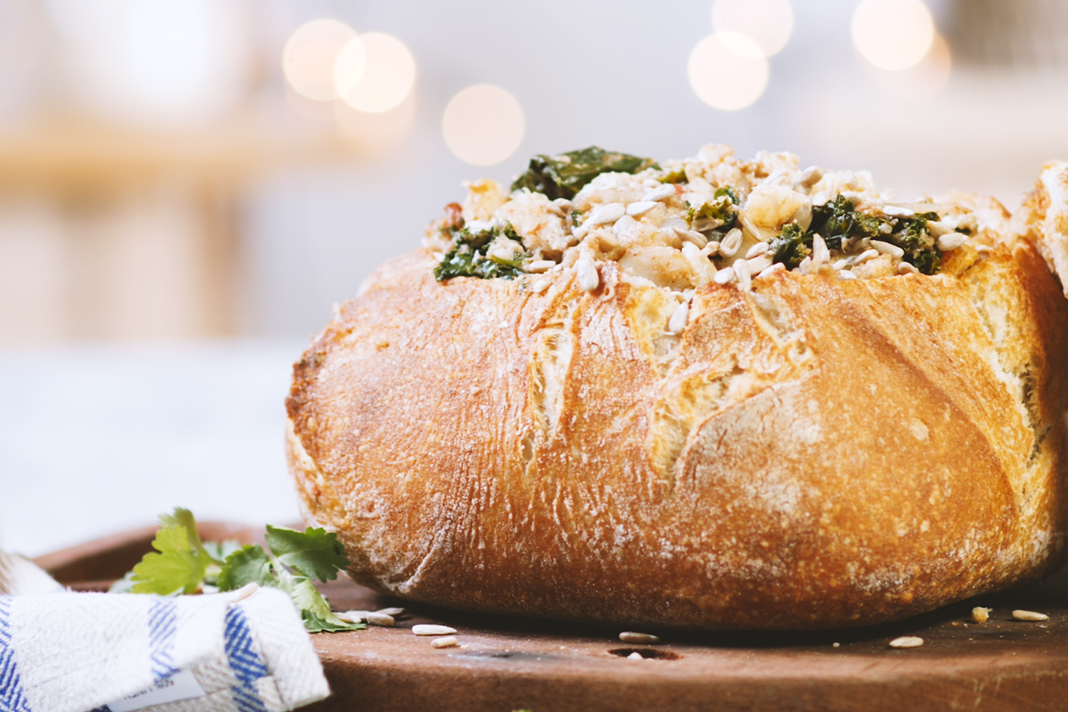 Os olhos já sorriem, mesmo antes de se provar o bacalhau no pão. Aqui o rei da festa dá nas vistas ao ser servido no pão da avó. Um ensaio de cor que combina a couve kale, os coentros e o aroma inusitado da canela.
