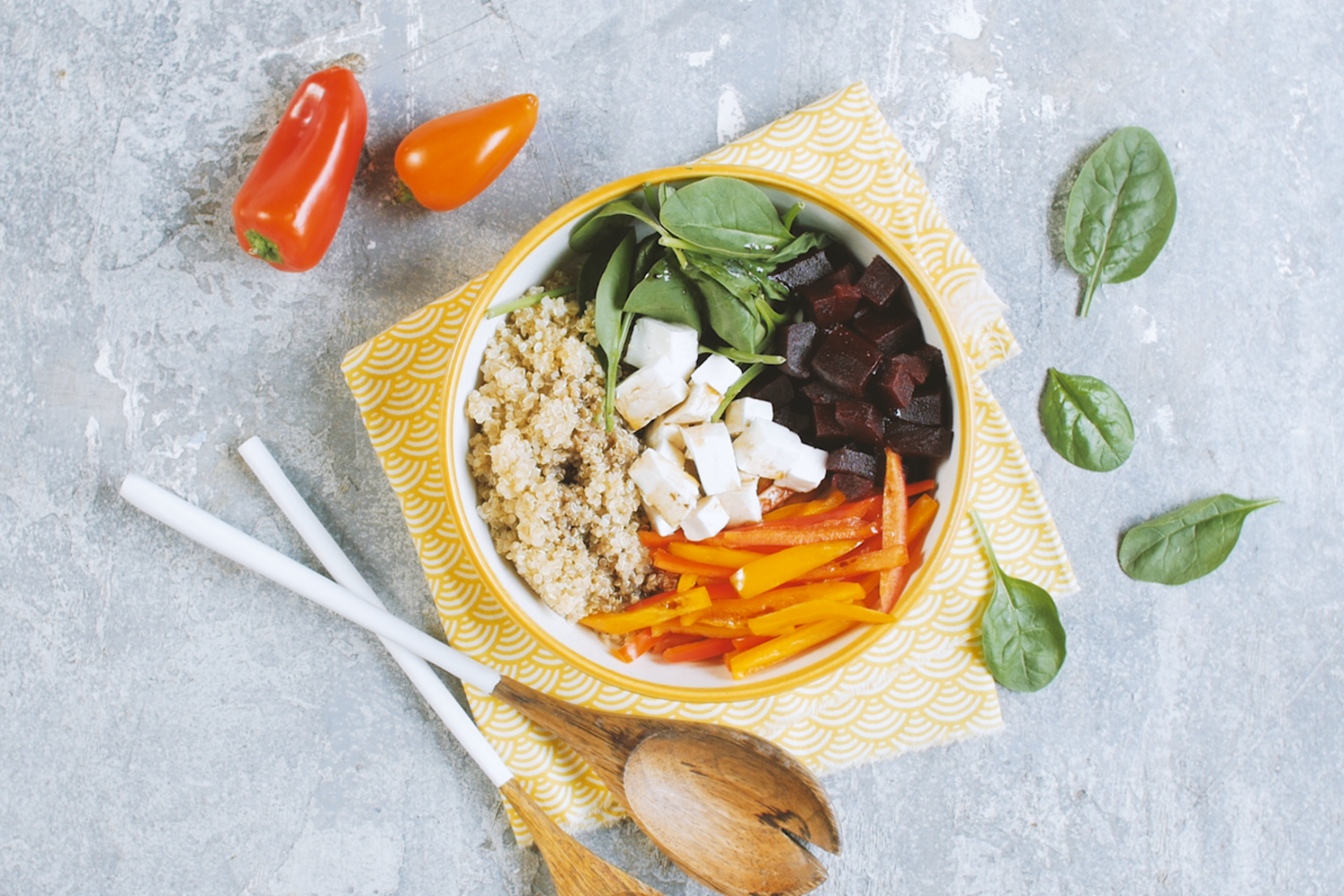 O almoço toma forma enquanto a mãe descansa num banho relaxante. À sua espera encontra a salada de quinoa, legumes e queijo de cabra, simples e rápida de preparar, mas com tantas cores e sabores que até os olhos riem!