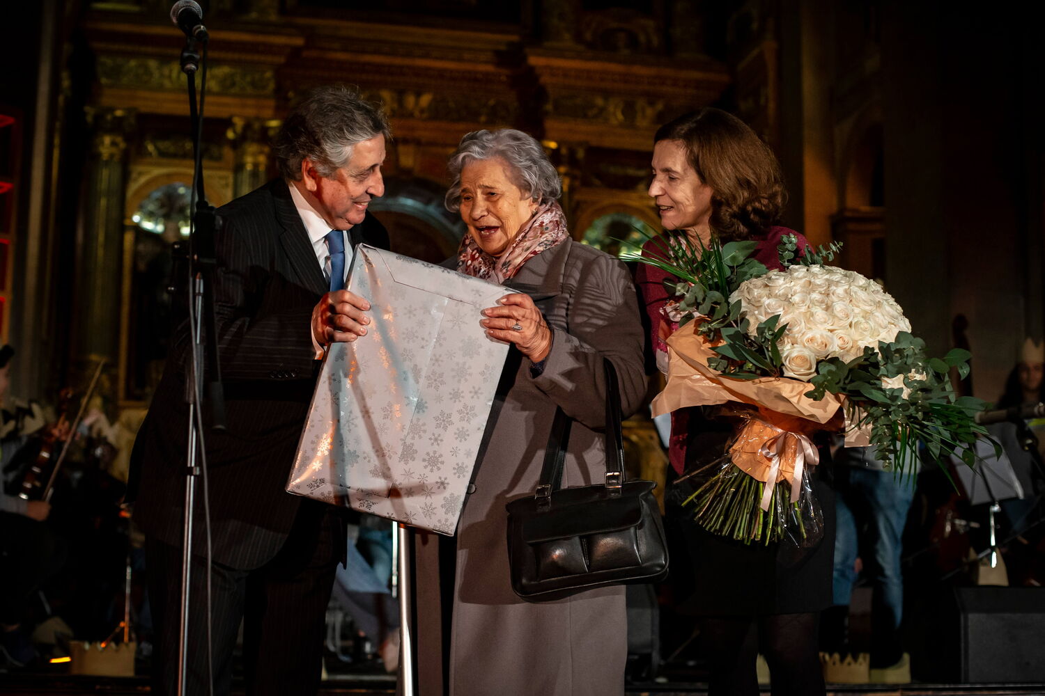 Um dos momentos mais emocionantes do Auto de Natal organizado pela Santa Casa na Igreja de São Roque, no Largo da Misericórdia, foi a entrega de um simbólico ramo de flores, composto por 100 rosas de cor branca, a D. Generosa Mesquita.