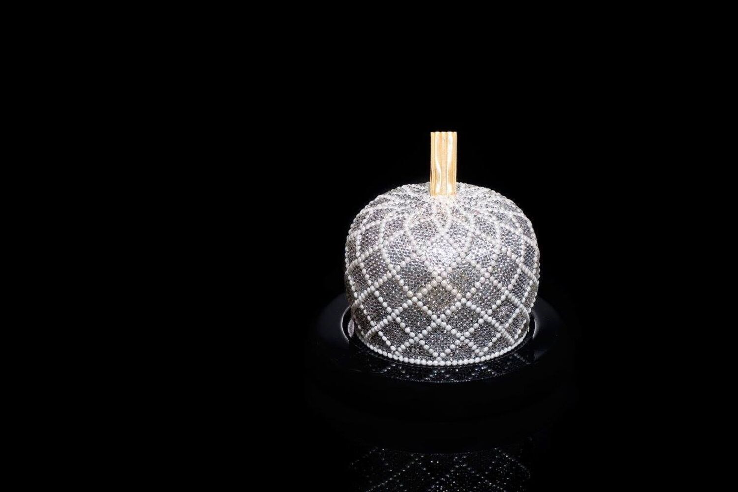 A embalagem é composta por uma base de madeira lacada a preto, com a gravação em ouro do número de série e uma campânula em cristal, revestida a milhares de cristais e pérolas Swarovski, finalizando com uma pega em fita de ouro.