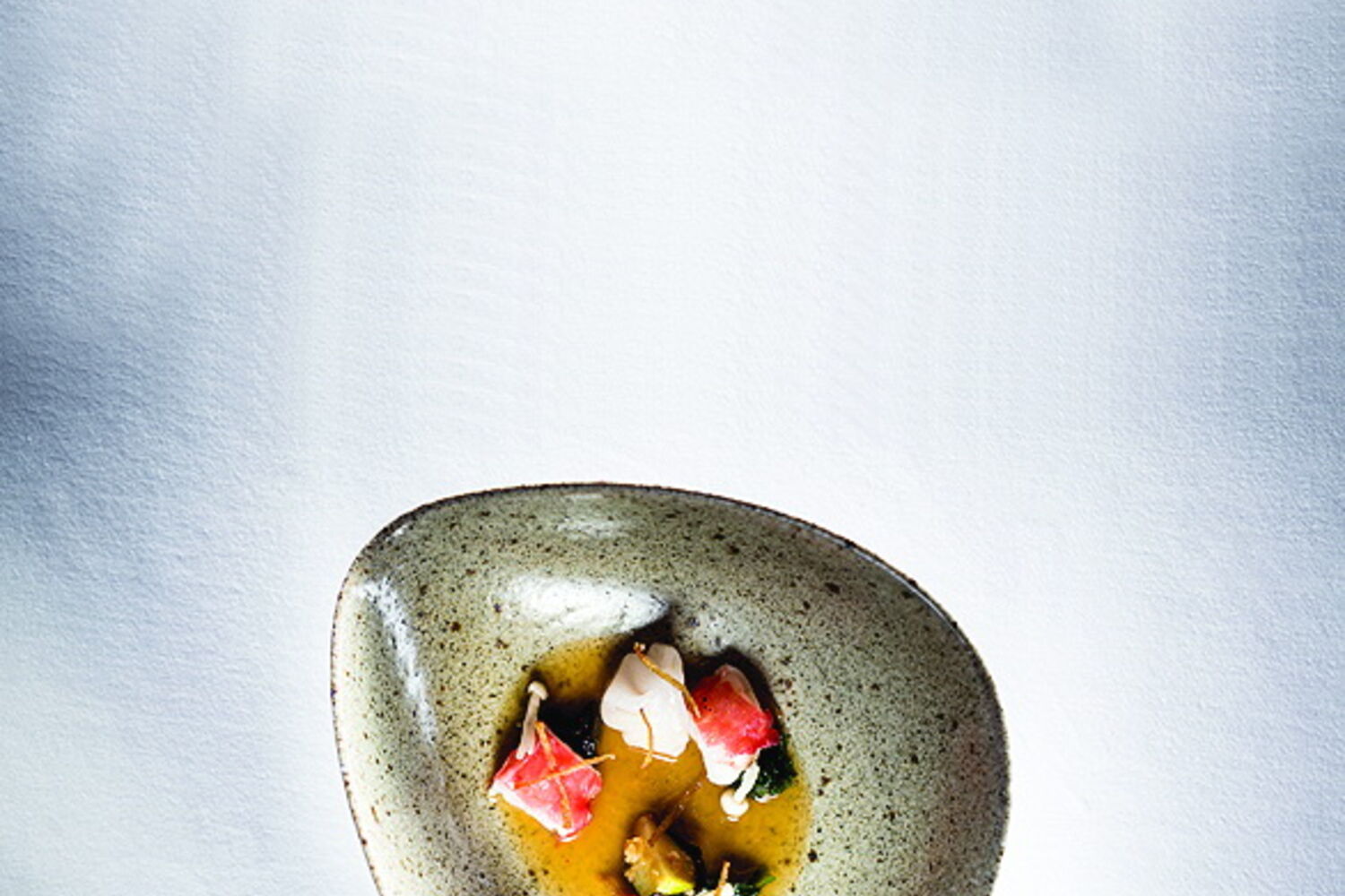 Sirva o lagostim com cabeça de cogumelo enoki crú, pé de cogumelo enoki frito, alga nori ,cebolete laminado, molho kimchi, har gow recheado e pasta de couve-de-bruxelas grelhada josper.