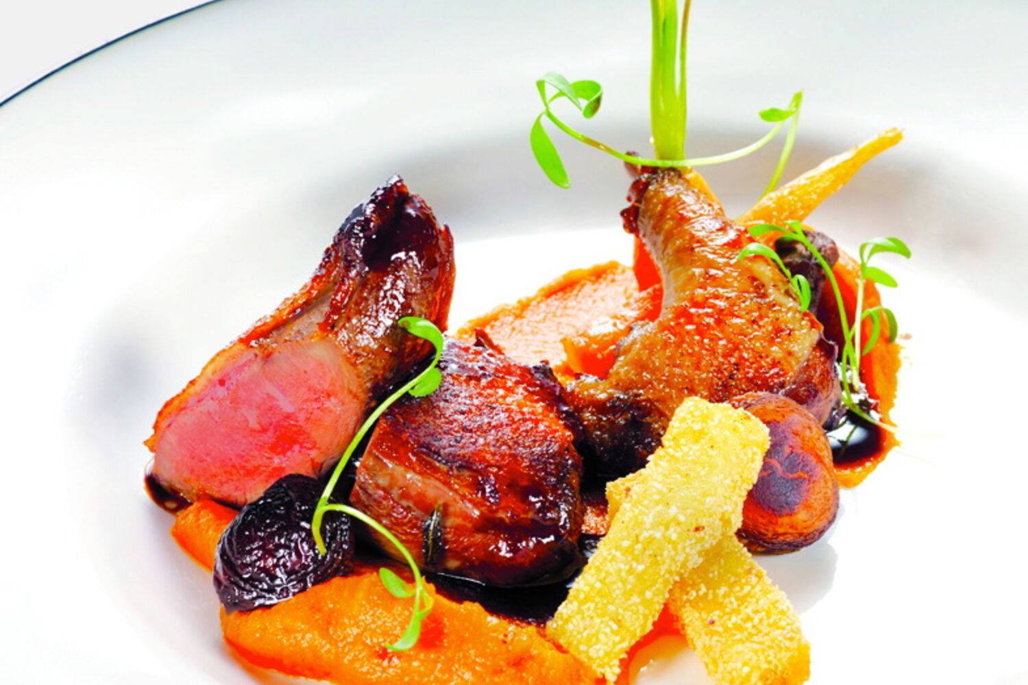 Estreia para as lulas, salada de feijão frade e pimentos com agrião (8,90 euros) ou o pombo Royal glaceado em seu jus, cremoso de cenoura e crocante de milhos (12,50 euros). Quanto aos pratos principais, destaque para o robalo corado com quinoa, ervilhas e molho de marisco (23,90 euros) ou a vitela com cevadinha cremosa de cogumelos & escalope de foie gras (24,70 euros). Nas sobremesas sobressai o refrescante parfait de frutos vermelhos & seu molho (6,90 euros).