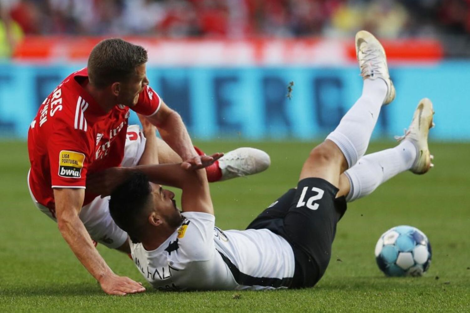 Roman Yaremchuk (Benfica) recebe cartão amarelo por uma entrada perigosa sobre Pedrão, que ficou caído no relvado.