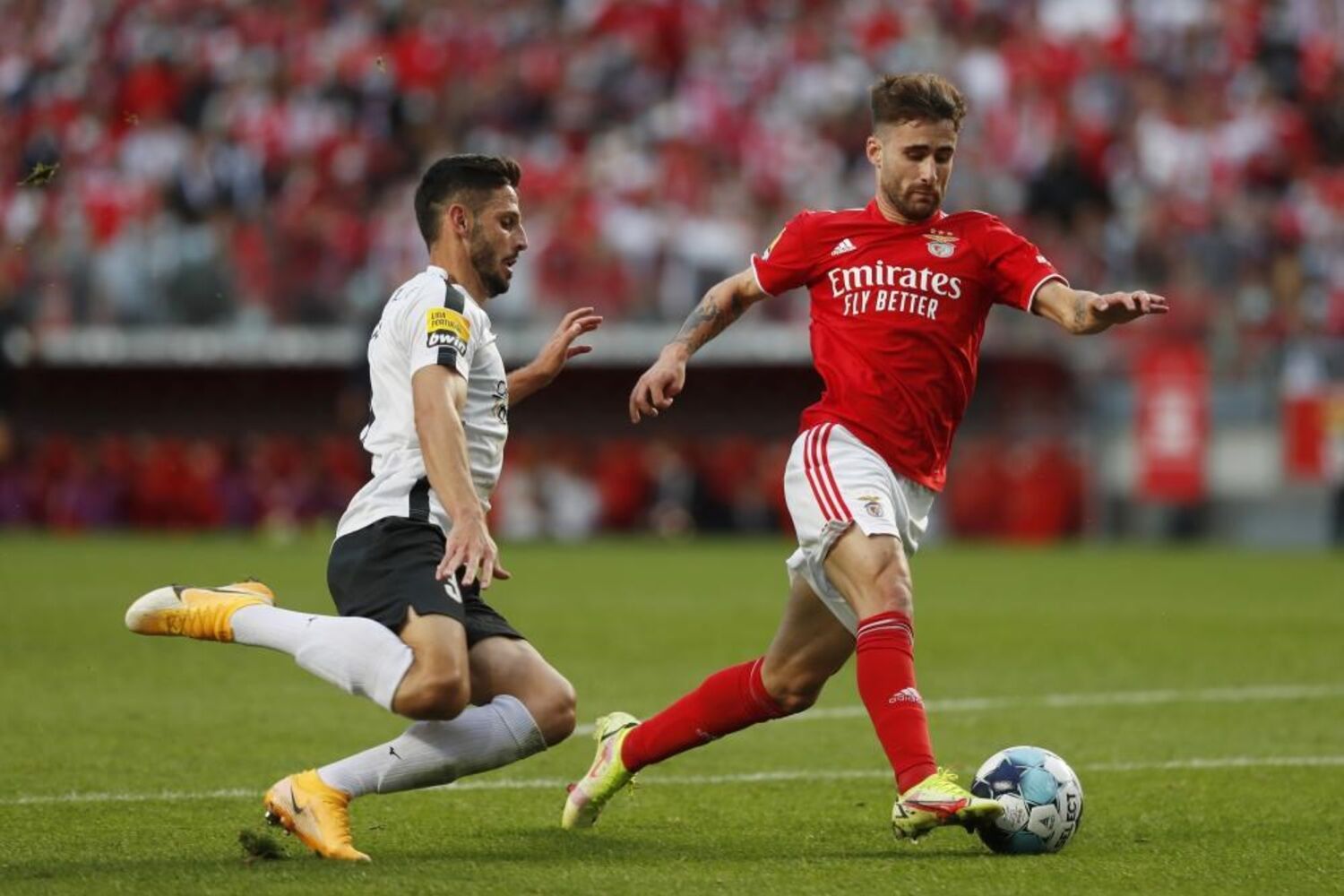 Oportunidade interceptada, Alejandro Grimaldo (Benfica) remate com o pé esquerdo de fora da área. Assistência de Rafa.