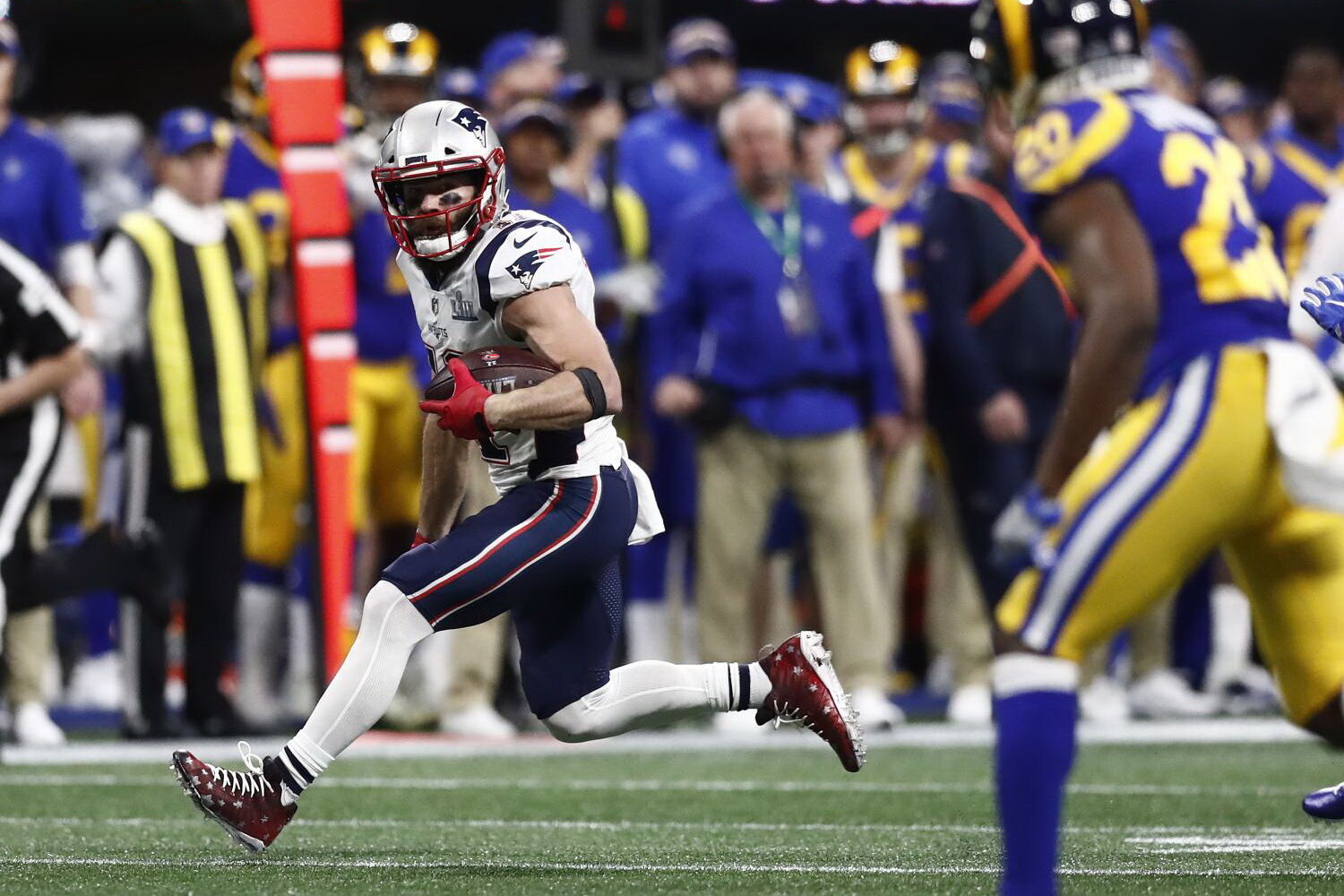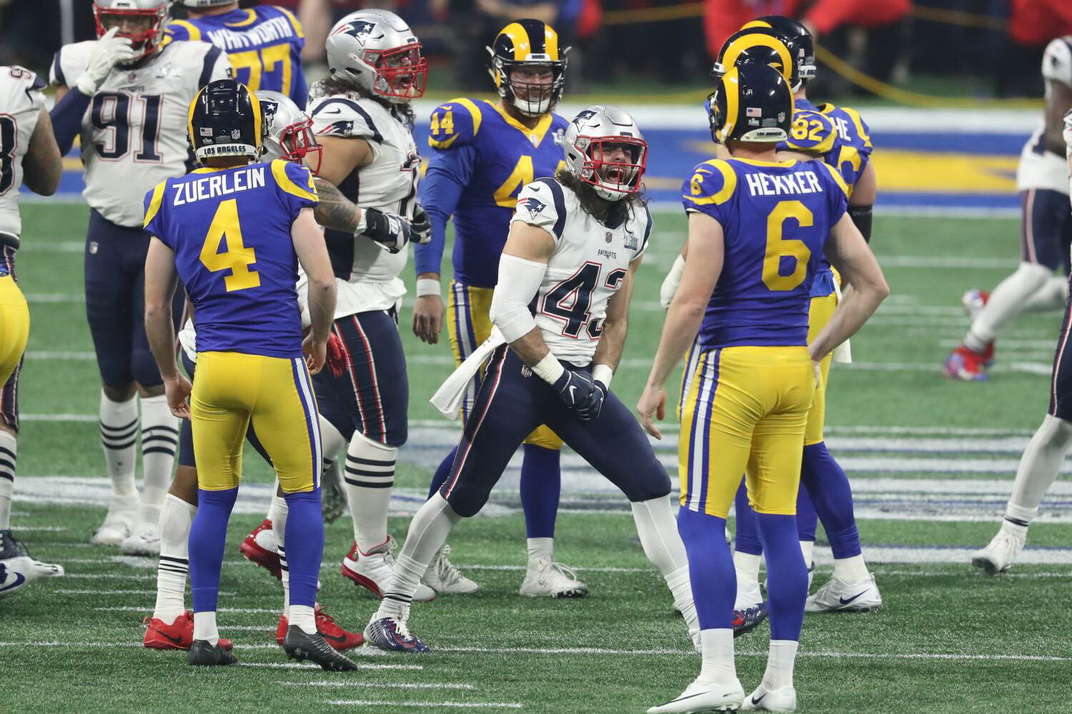 Os Patriots, que jogavam o Super Bowl pela 11.ª vez, um recorde, em 53 edições, tendo perdido em 1986, 1997, 2008, 2012 e 2018, já haviam batido os Rams (20-17) na final de 2002.