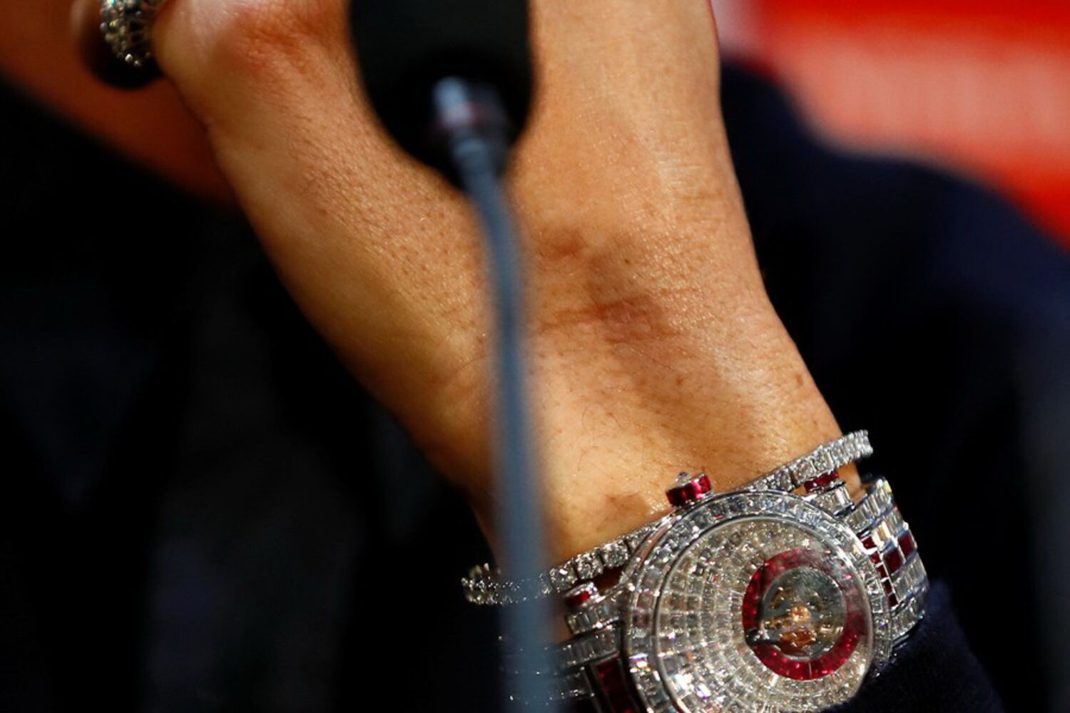 A peça de relojoaria não ficou indiferente a ninguém. O relógio, da marca Franck Muller, é composto por 424 brilhantes brancos e vermelhos.