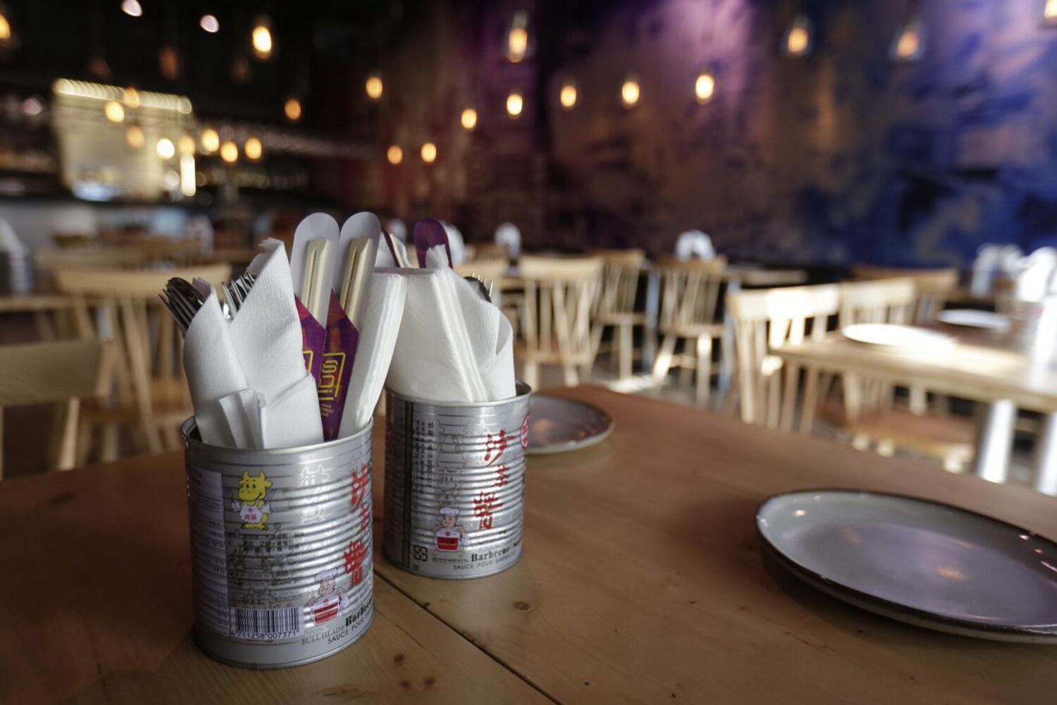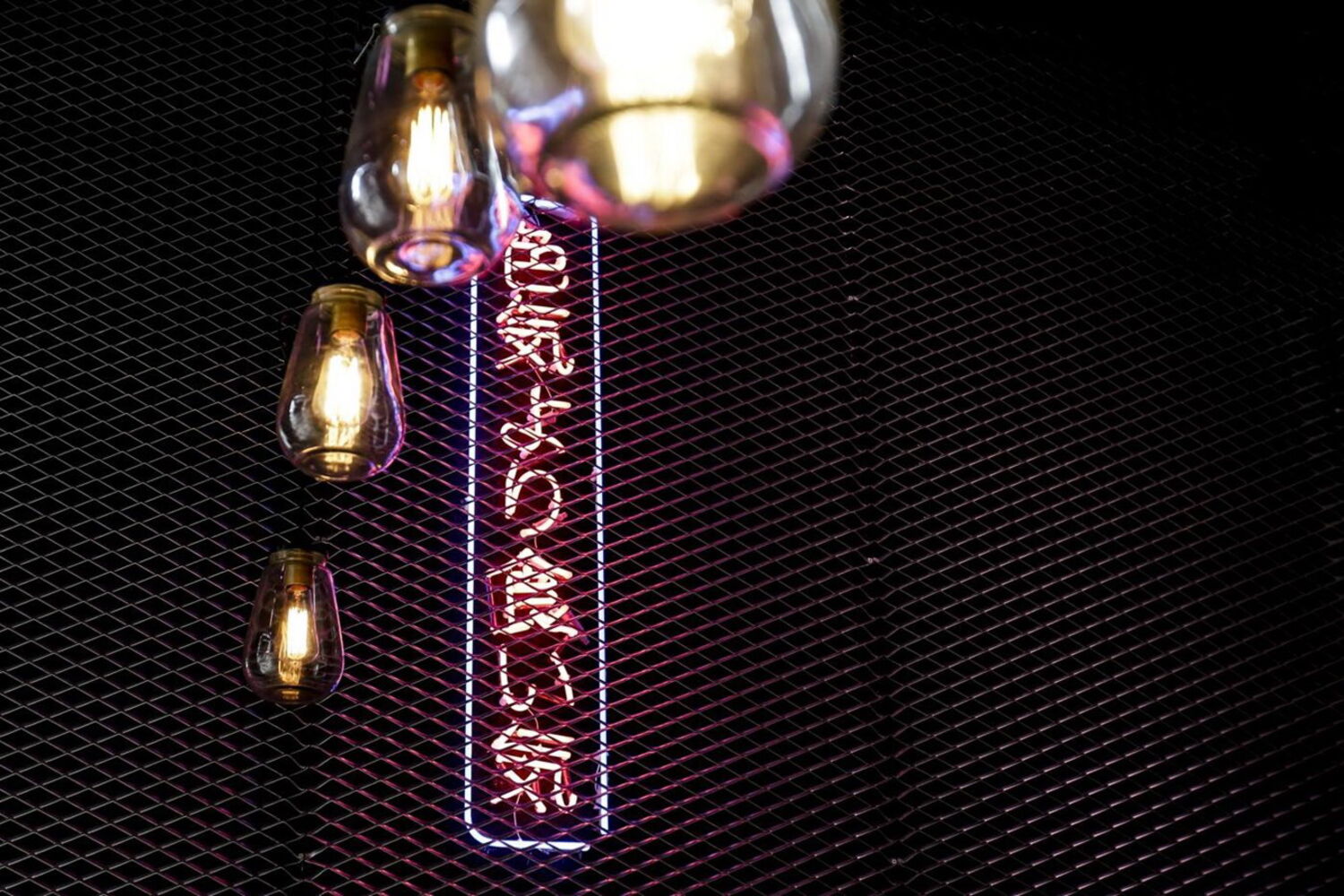 A viagem pelo mundo oriental começa mal se entra no estabelecimento. A decoração moderna e industrial tem as luzes néon típicas destes países, papel de parede com motivos asiáticos de um lado e uma malha metálica de outro.