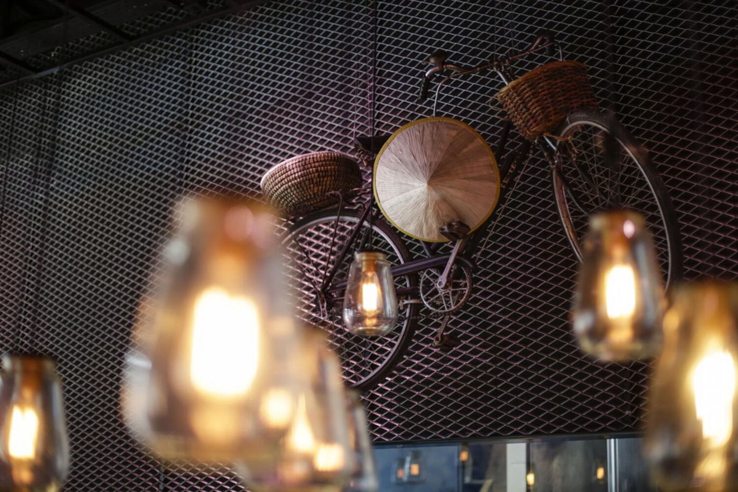 No tecto, além dos candeeiros que parecem apenas lâmpadas, está pendurada uma bicicleta com um chapéu de palha vietnamita.