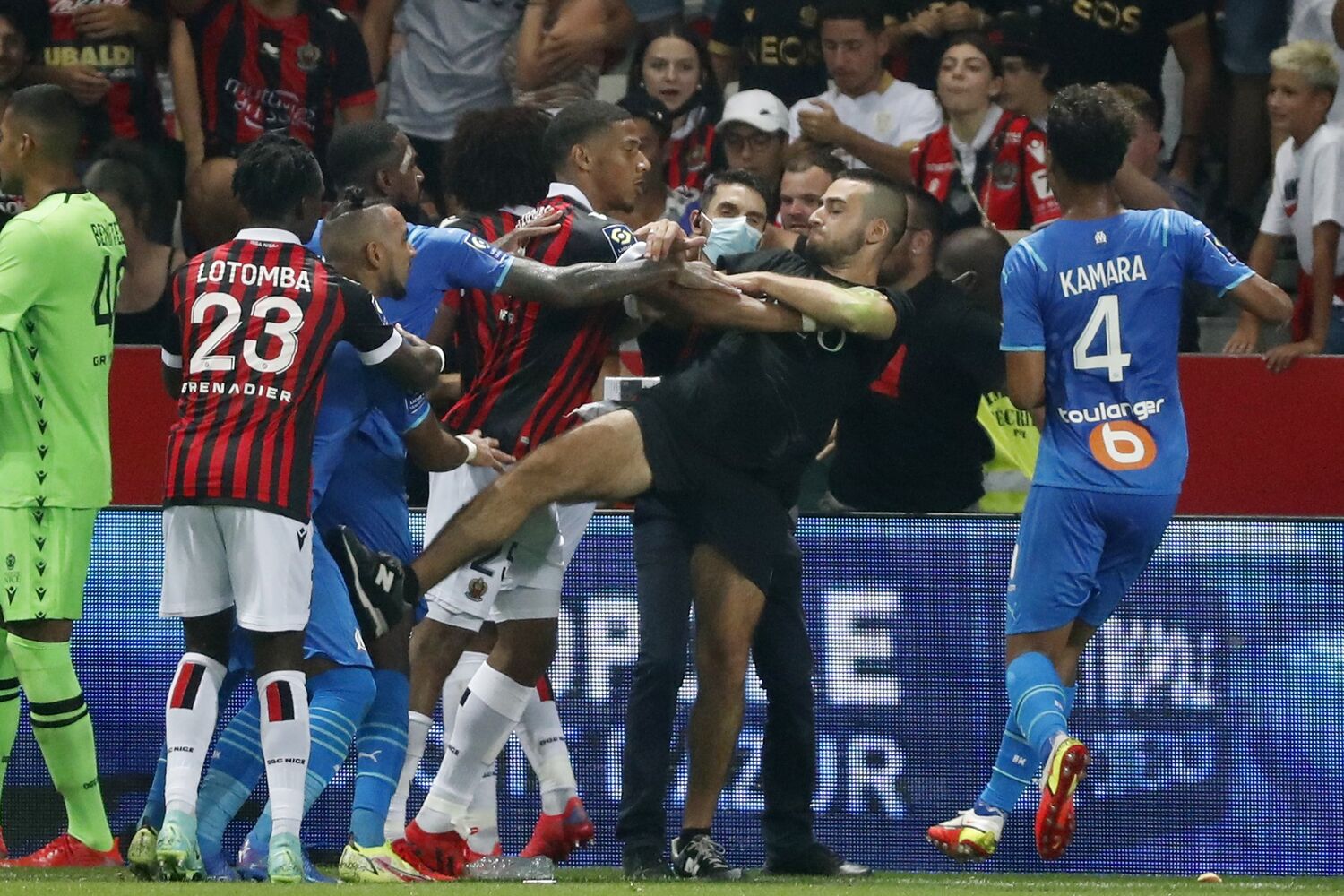 Os acontecimentos resultaram numa invasão de campo e numa autêntica 'batalha campal', que obrigou todos os jogadores a recolher aos balneários e levou o árbitro, Benoit Bastien, a interromper provisoriamente a partida quando o Nice vencia com um golo de Kasper Dolberg (49).