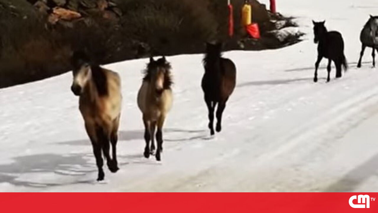 Cavalos selvagens percorrem a pista de esqui na Serra Nevada