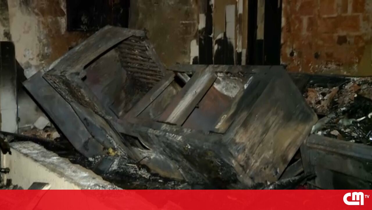 Loja abandonada consumida pelas chamas em Almada
