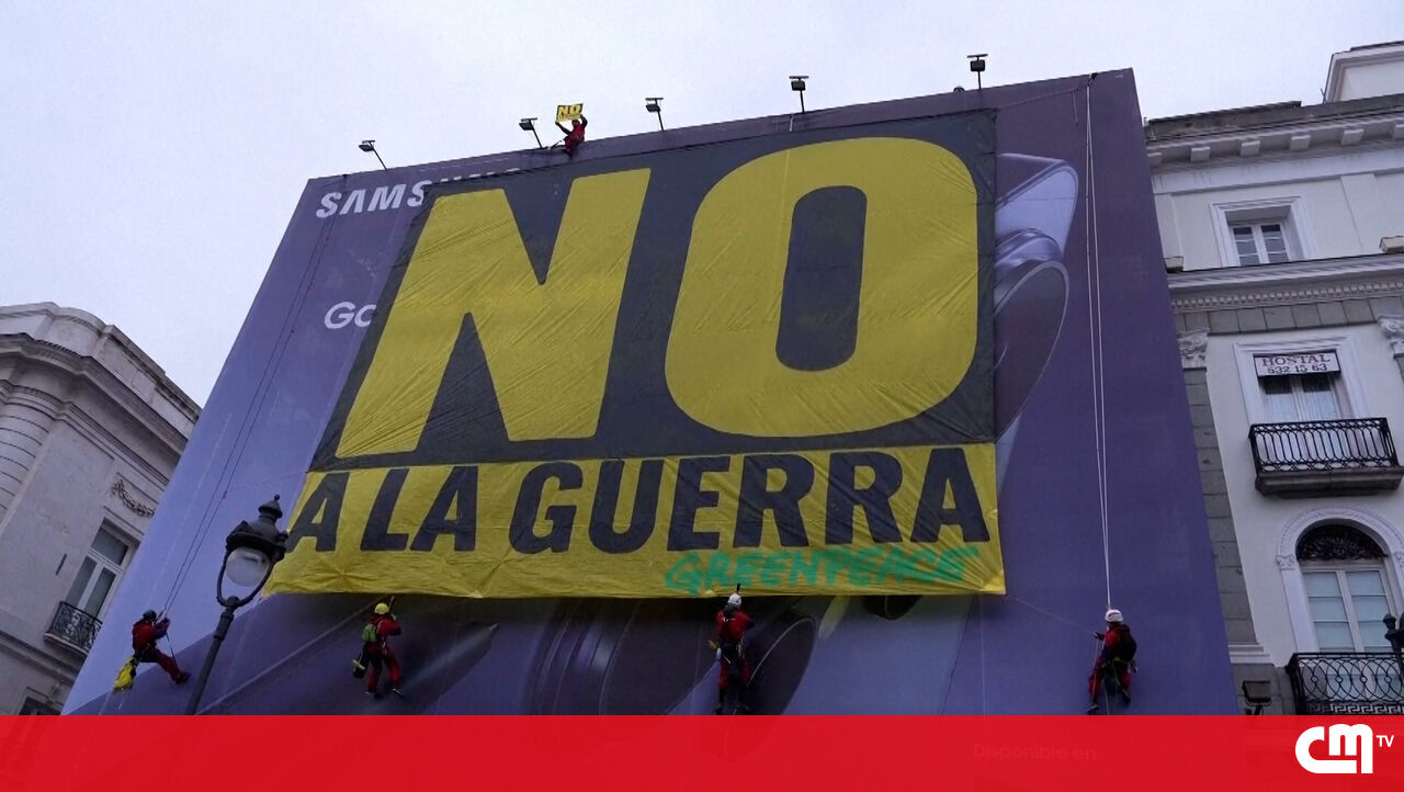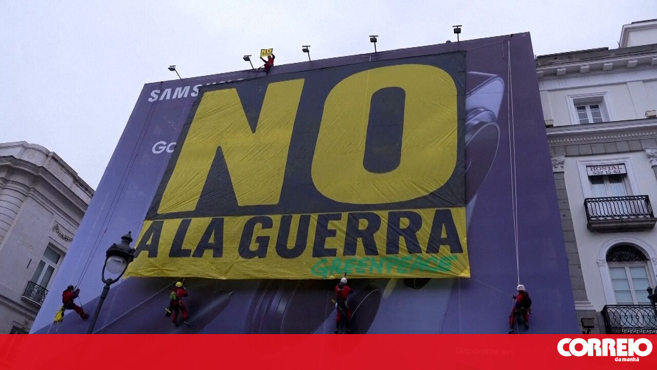 Ativistas da Greenpeace colocam faixa de ‘Não à guerra’ em Madrid