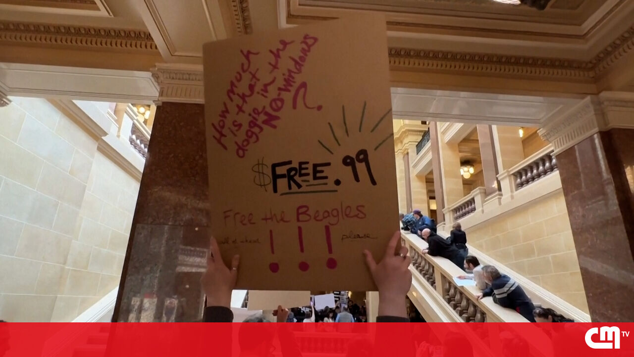 Manifestação em frente ao gabinete de Tony Evers, no Capitólio, decorreu esta segunda-feira com o principal mote “Libertem os cães!”. Os ativistas exigem que sejam libertados quase dois mil cães da raça Beagle que estão fechados num centro de criação e investigação animal.