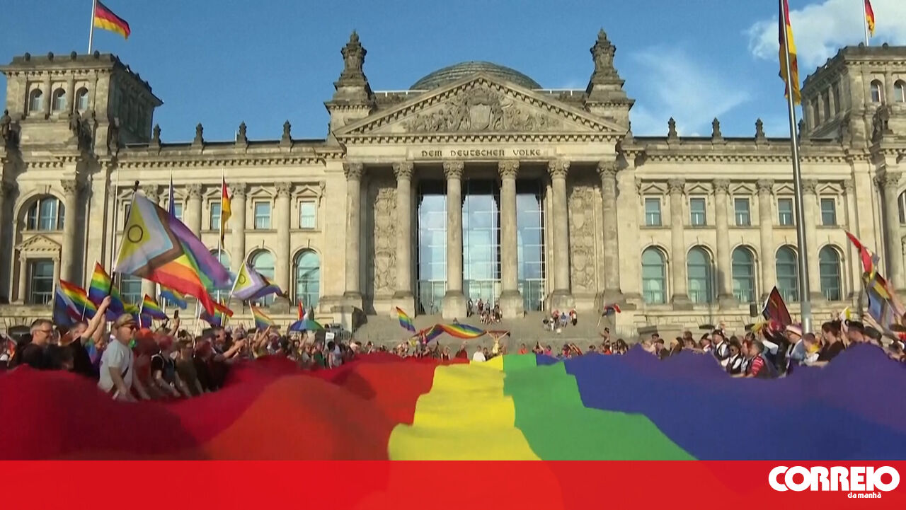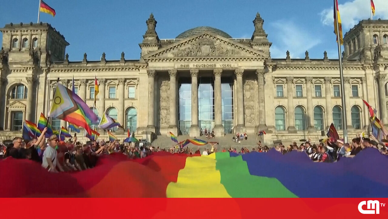 Ativistas LGBTQ+ estenderam uma bandeira arco-íris gigante em frente ao parlamento alemão, em protesto contra a decisão de não hastear o símbolo durante a marcha anual do 'Pride'.