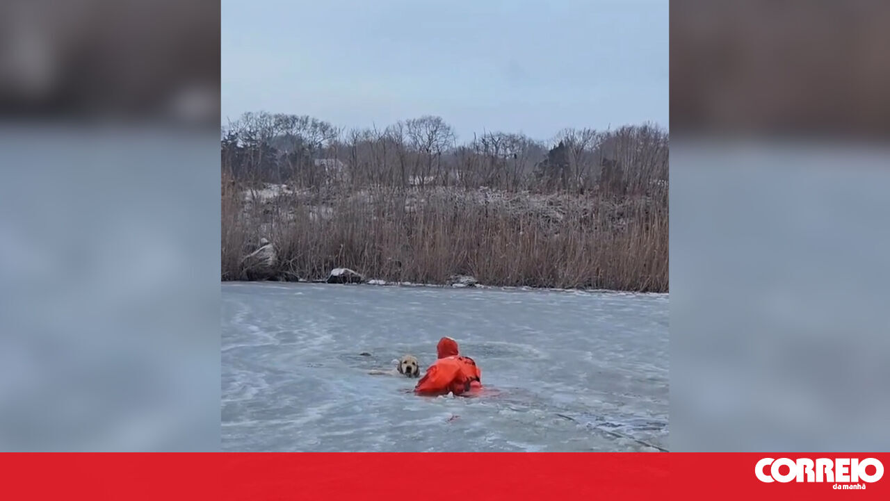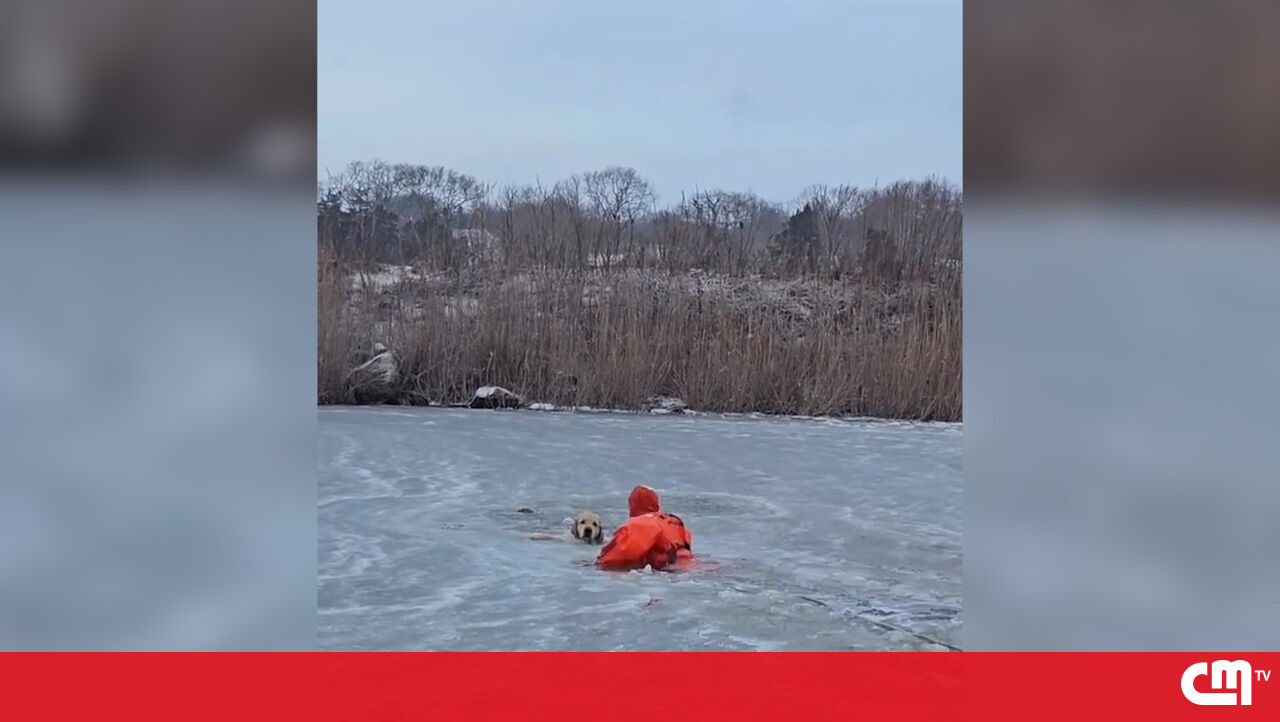 Imagens mostram o momento em que um bombeiro de Rhode Island, nos EUA, atravessa um lago congelado para salvar Phoenix, um golden retriever que ficou preso no gelo no dia de Ano Novo.