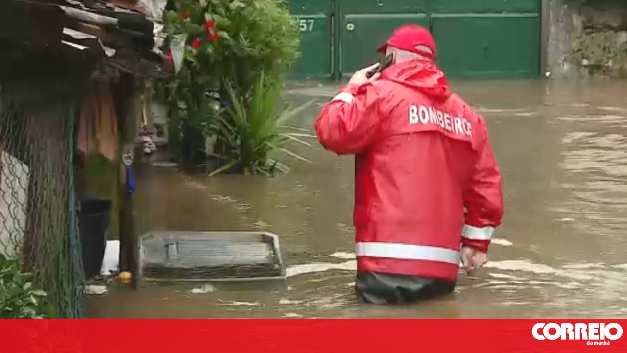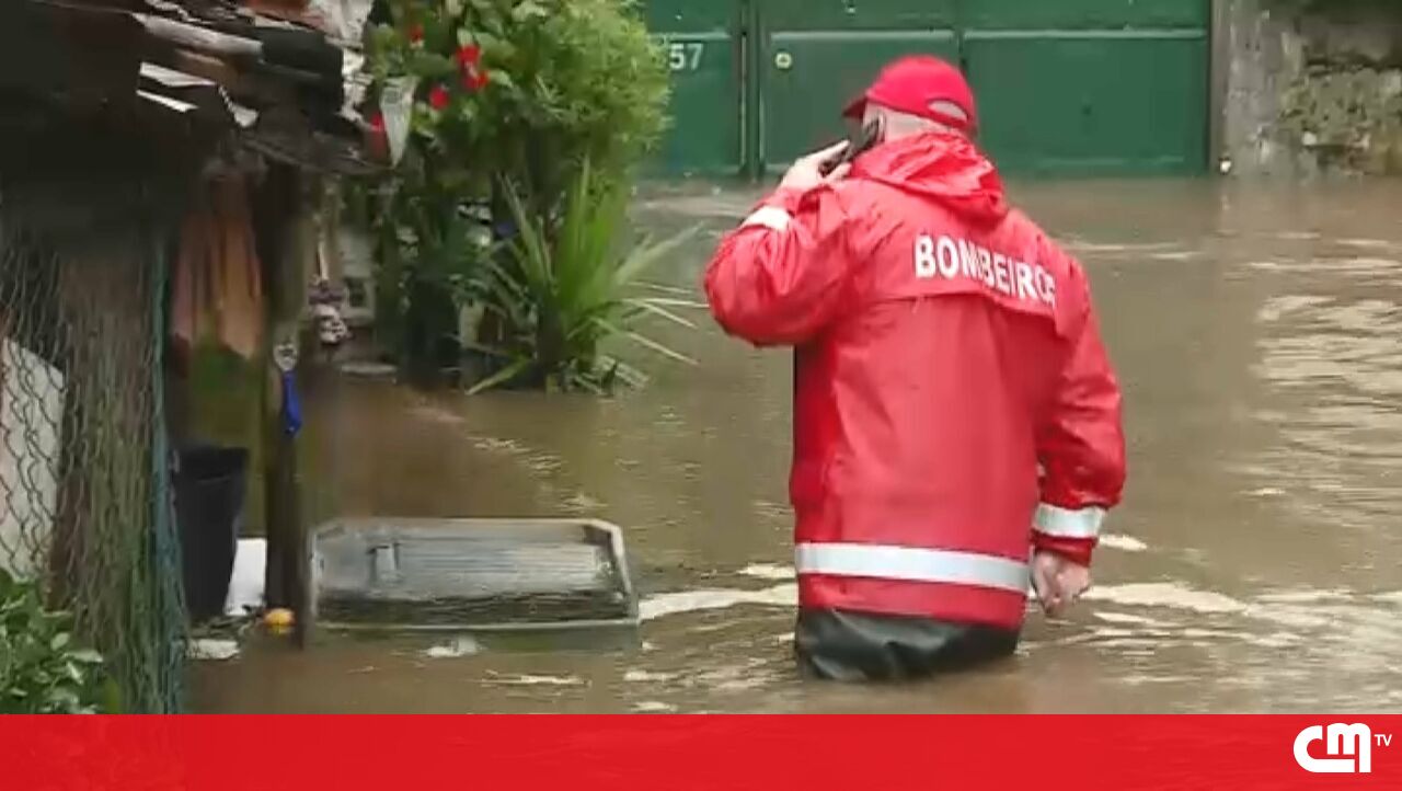 Bombeiro de Avintes caminha com água perto da cintura após rio Febros transbordar
