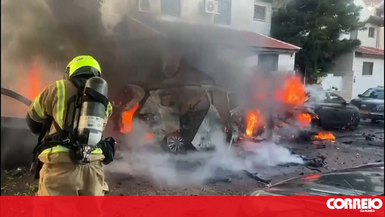 Imagens mostram equipas de bombeiros a combater vários focos de incêndio provocados pela queda de destroços de mísseis intercetados pelas defesas aéreas israelitas, após novos ataques lançados pelo Irão contra a região de Telavive.