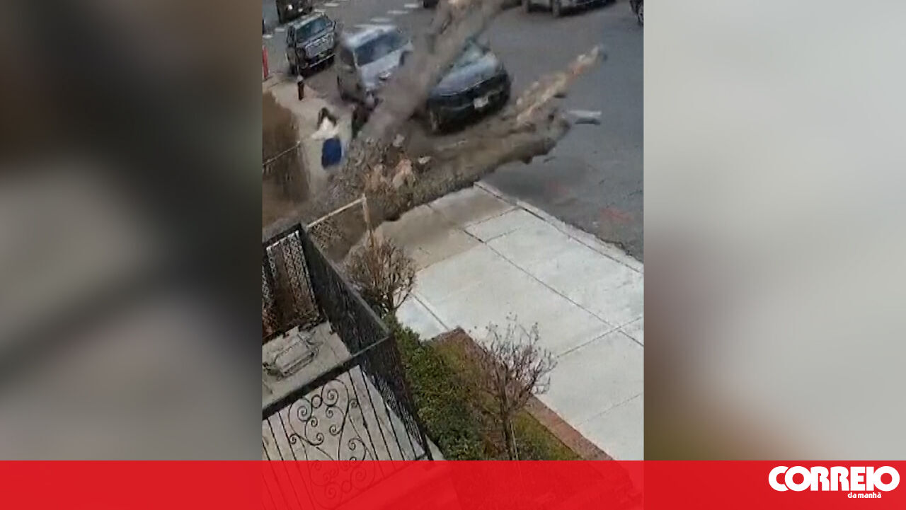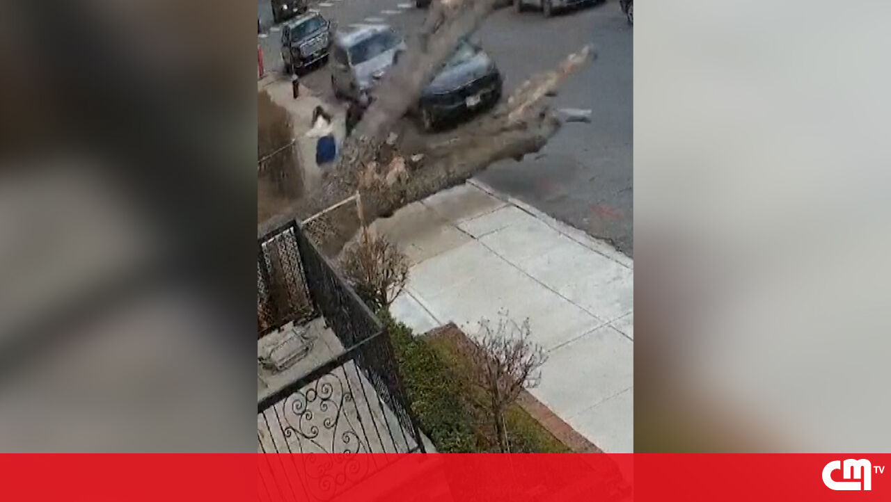 Imagens de videovigilância mostram três pessoas que seguiam a pé a escaparem por segundos de serem atingidas por uma árvore de grande porte que caiu num passeio em Brooklyn, Nova Iorque, EUA, este sábado.