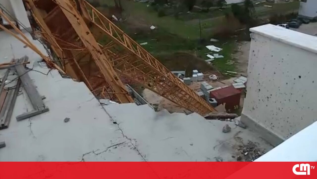 Grua cai em prédio devido ao vento forte na Marinha Grande