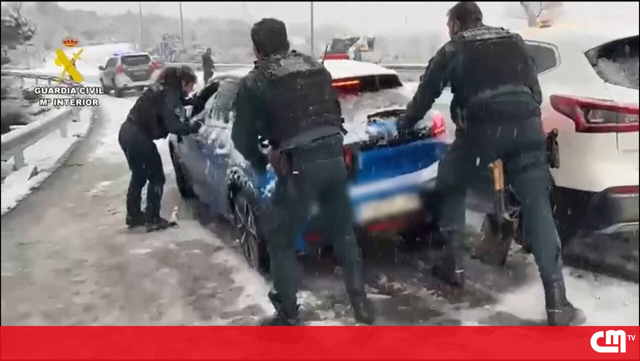 Guardia Civil espanhola ajuda condutores presos na neve em Madrid