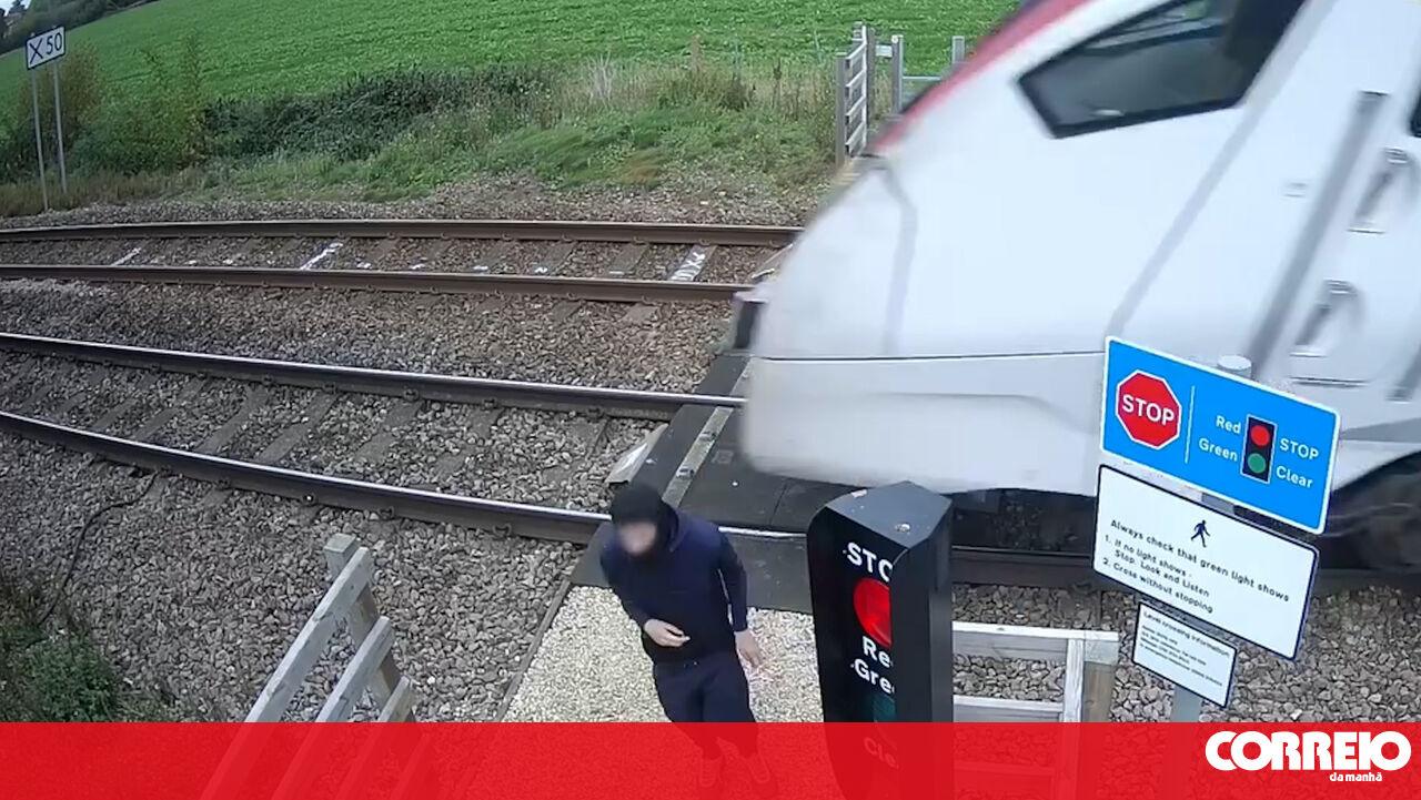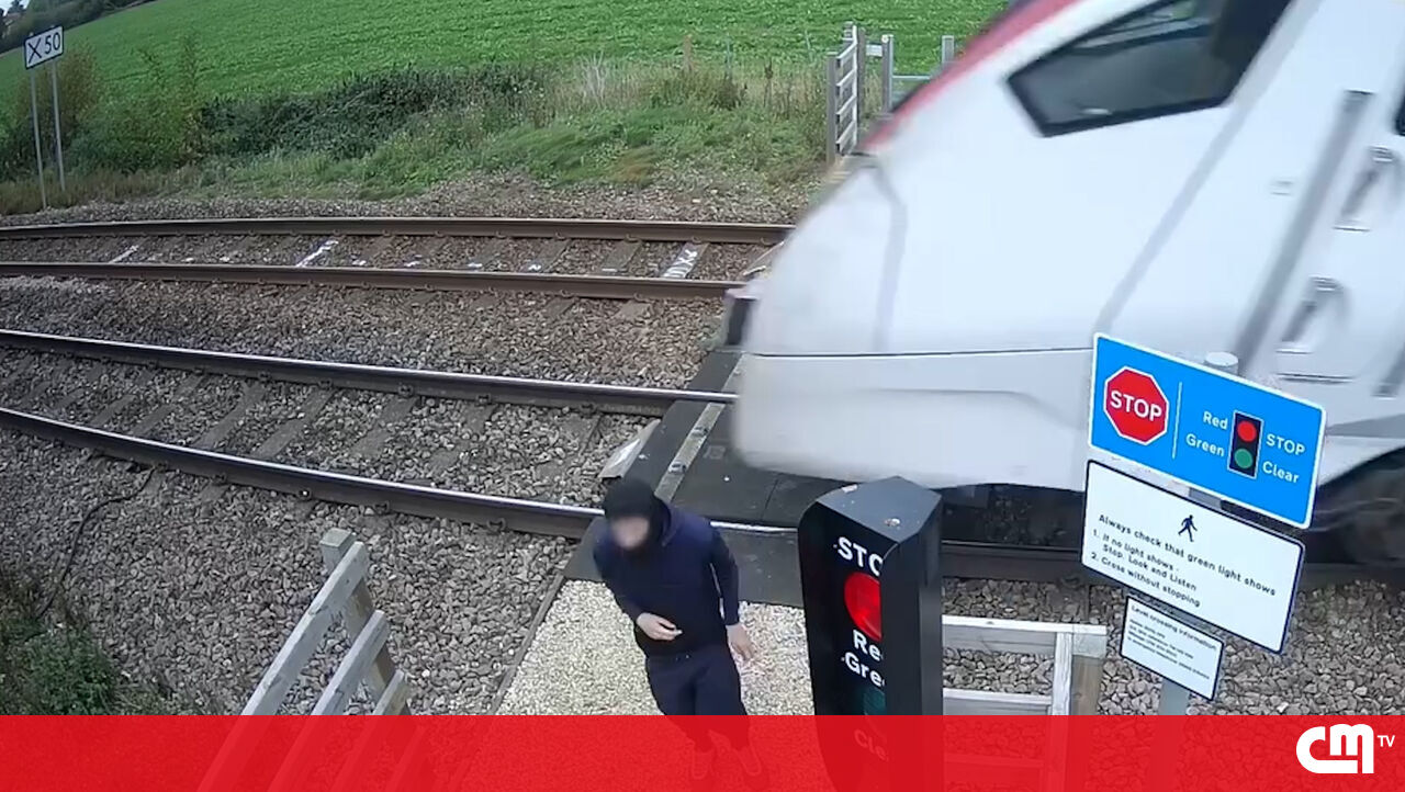 Imagens de videovigilância mostram o momento em que um jovem salta para trás no último segundo antes de um comboio passar a cerca de 160 km/h, numa passagem de nível perto de uma estação em Norfolk, no Reino Unido.