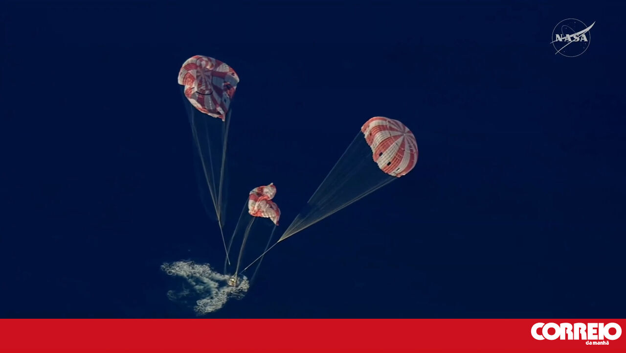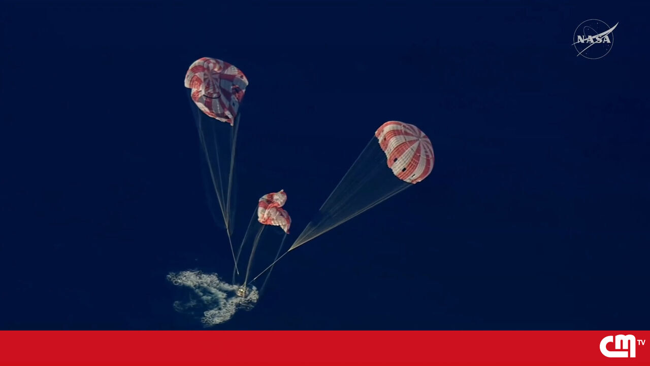 O momento em que a cápsula 'Orion' da missão Artemis II amara no Oceano Pacífico