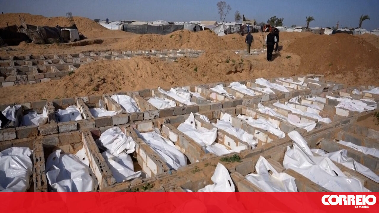 Os corpos de 53 palestinos não identificados, juntamente com 68 órgãos e restos mortais, foram sepultados, esta sexta-feira, numa vala comum em Deir Al-Balah, no centro da Faixa de Gaza.