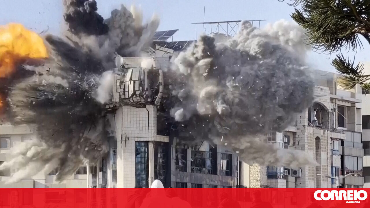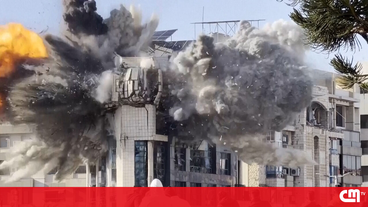 Imagens mostram o instante em que um edifício é destruído por um ataque aéreo em Beirute, com explosões visíveis e uma enorme coluna de fumo a subir sobre a área depois do impacto.