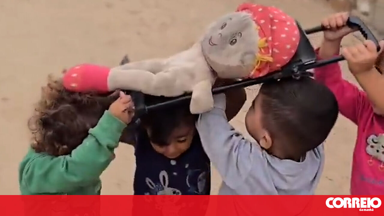 Imagens partilhadas nas redes sociais mostram crianças em Gaza a pegar num boneco e a colocá-lo nos ombros como se faz nos funerais.