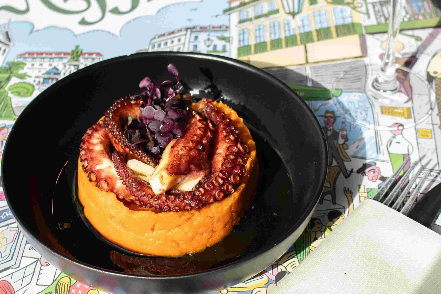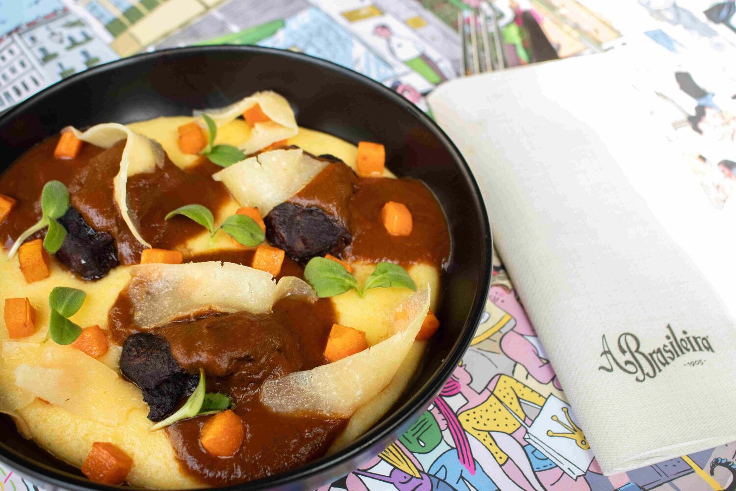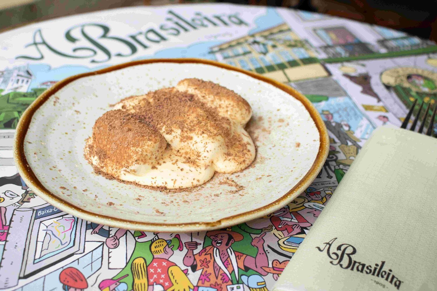 O sol já lá vai, mas deixou um tom quente e nostálgico à mesa d’A Brasileira. O Chef Nuno Carreira renovou a carta, mantendo os clássicos como o Bife com molho à café – o prato que persiste há anos em homenagem ao poeta que tanto o apreciava e que ali continua a ocupar a esplanada - ou o tão português bacalhau assado.