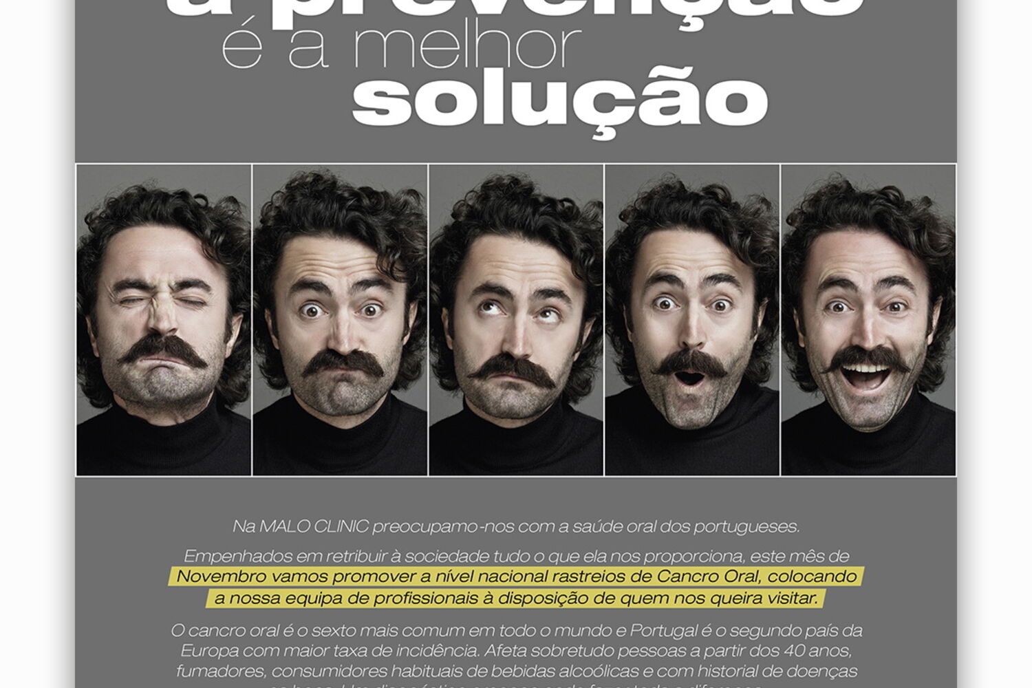 Na saúde oral a prevenção é a melhor solução e o cancro oral não é exceção. Empenhada em zelar pela saúde oral dos portugueses e protegê-los deste que é o sexto tipo de cancro mais comum em todo o mundo, a Malo Clinic vai, ao longo de todo o mês de novembro, promover a nível nacional uma campanha de rastreios gratuitos de cancro oral, colocando a sua equipa de profissionais à disposição de quem queira visitar para esse efeito uma das suas 13 clínicas espalhadas pelo país.