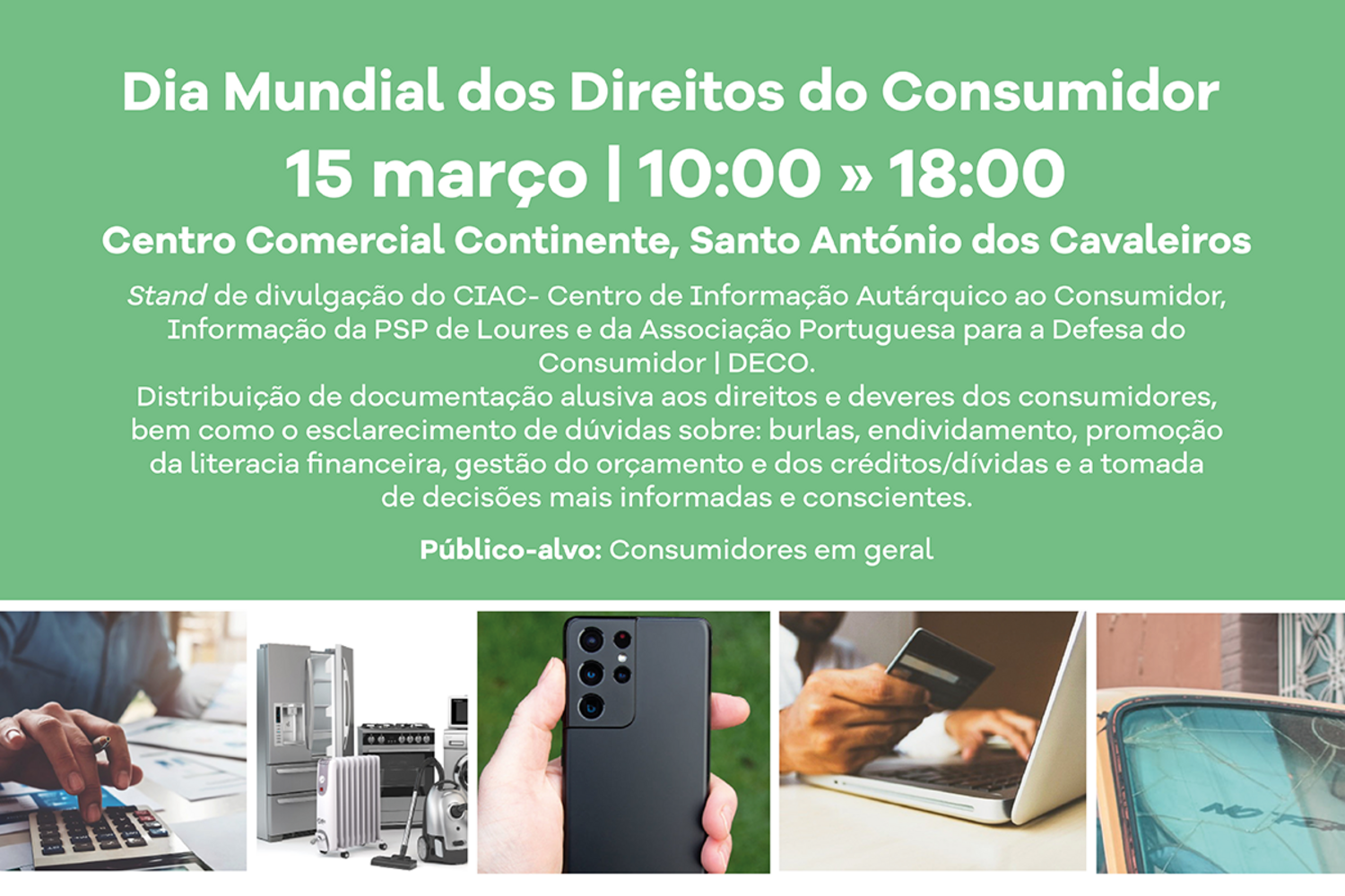 No âmbito do Dia Mundial dos Direitos do Consumidor, no próximo dia 15 de março, o Centro Comercial Continente de Loures recebe, entre as 10h00 e as 18h00, uma importante ação informativa e de esclarecimento de dúvidas alusiva aos direitos e deveres dos consumidores.