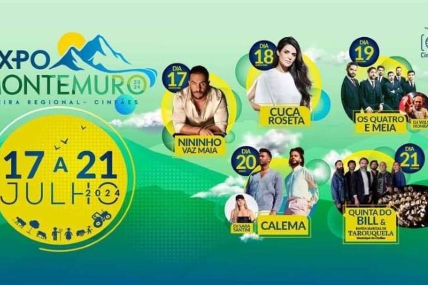 São cinco os grandes concertos da ExpoMontemuro. Nininho Vaz Maia na quarta-feira dia 17 às 22h. Na quinta-feira feira será Cuca Roseta, que atua no parque da feira às 22h. Os Quatro e Meia são o grande espetáculo de sexta-feira (às 23h) dia 19, no sábado o palco será dos Calema (às 23h) e o fecho da edição 2024 da ExpoMontemuro será com os Quinta do Bill, que serão acompanhados pela Banda Marcial de Tarouquela e Municipal de Cinfães. Mais informação em www.cm-cinfaes.pt.