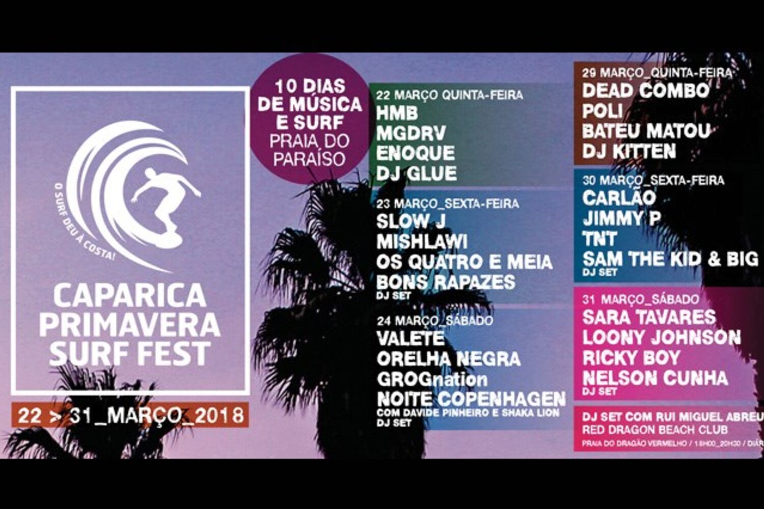 O Caparica Primavera Surf Fest é único: são 10 dias de celebração do espírito comunitário que une as novas gerações de ondas e surf, reunindo os melhores atletas nacionais e internacionais, em que as concorrentes femininas disputam prémios monetários iguais aos dos concorrentes masculinos e em que o palco se assume como mostra do melhor da nova música urbana portuguesa.A segunda ronda de concertos começará a 29 de Março com a máxima força de Bateu MatouPoliCorreiaDead Combo, todos com estreias importantes onde as guitarras, as baterias, o ritmo e a originalidade são fatores determinantes. A 30 de Março mais uma mão cheia de grande hip hop com o veterano Carlão, o fenómeno Jimmy P e o valor seguro da casa TNT. Os concertos terminarão no dia 31 com uma noite sintonizada com o melhor do afro-pop e espetáculos assegurados por Sara TavaresLoony JohnsonRicky Boy
