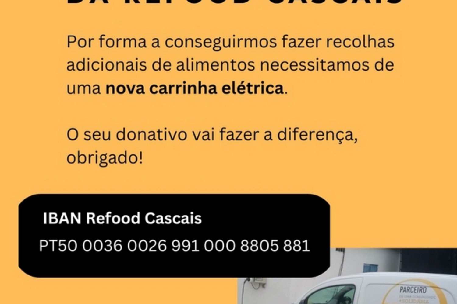 Pode contribuir para materializar o objetivo de aquisição deste novo equipamento fazendo o seu donativo para o IBAN da Refood Cascais. Cada donativo pode originar um recibo para efeitos de IRS, bastando que envie o comprovativo para: geral.cascais@re-food.org