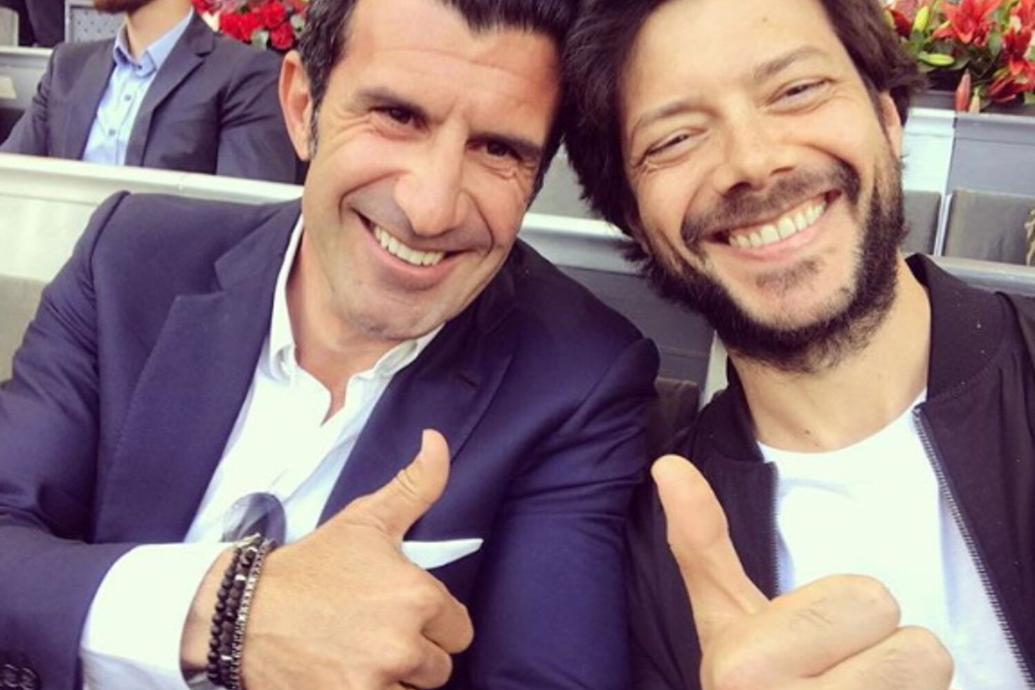 "Uma tarde genial. Aqui com Luís Figo um homem estupendo", escreveu o ator espanhol na legenda da imagem.