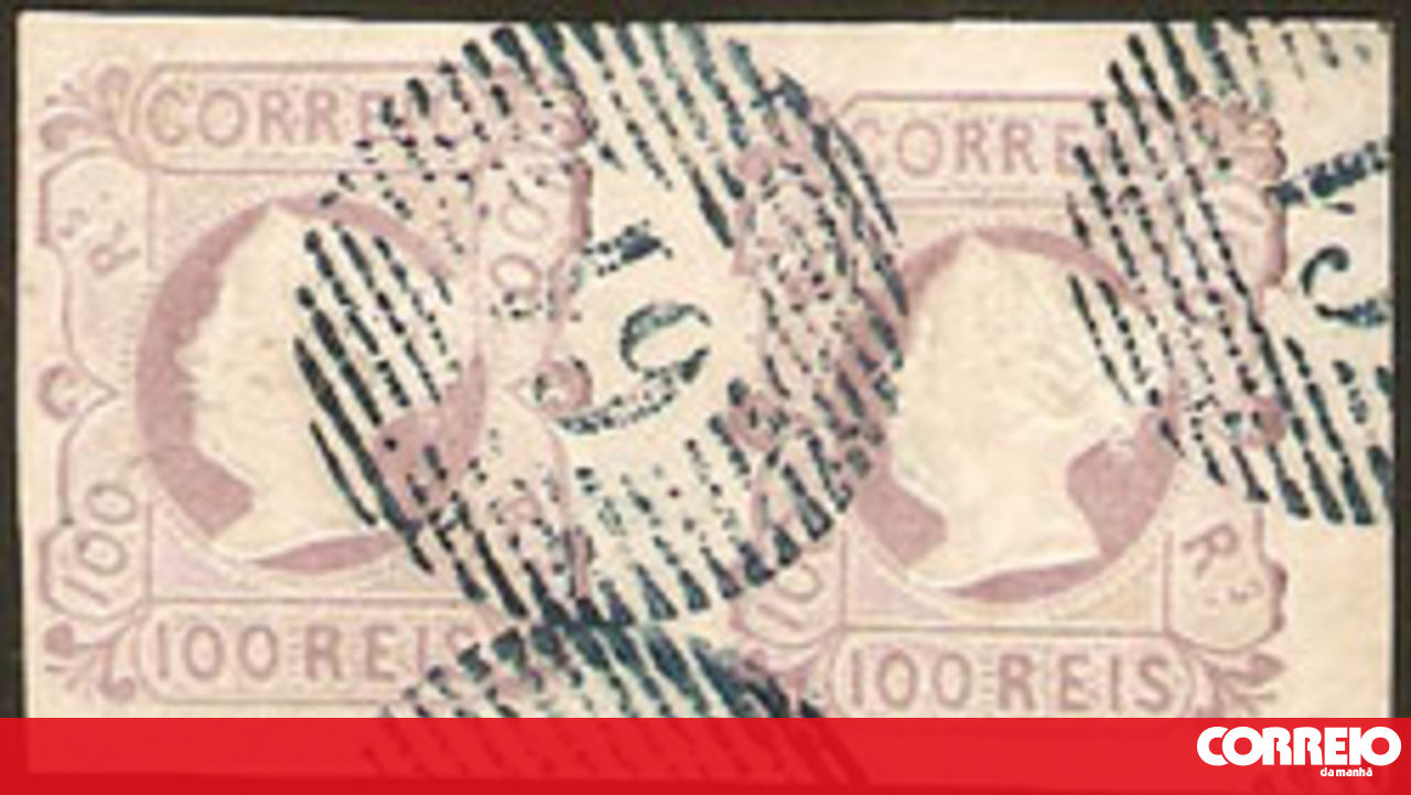 Um par do selo de 100 réis de D. Maria II, lilás malva, taxa mais alta da primeira emissão portuguesa em 1853, obliterado com o carimbo de barras ‘61’ Guimarães, em excelente estado, tem base de licitação de 2800 euros.