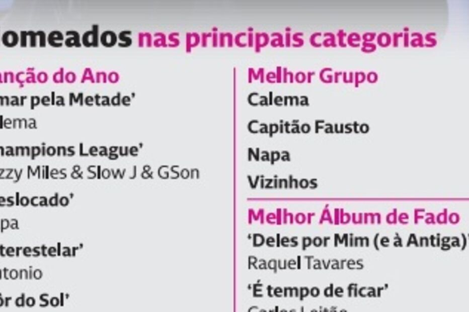 Com direito a transmissão em direto pela RTP1 (com a apresentação a cargo de Filomena Cautela), a cerimónia vai distinguir os melhores dos melhores da música nacional, e tem, este ano, Carminho em grande destaque. A fadista – que editou o álbum ‘Eu Vou Morrer de Amor ou Resistir’ no ano passado – é a mais nomeada, podendo levar para casa quatro estatuetas: a de Melhor Artista Feminina; Melhor Álbum; Melhor Álbum Fado e Prémio da Crítica.