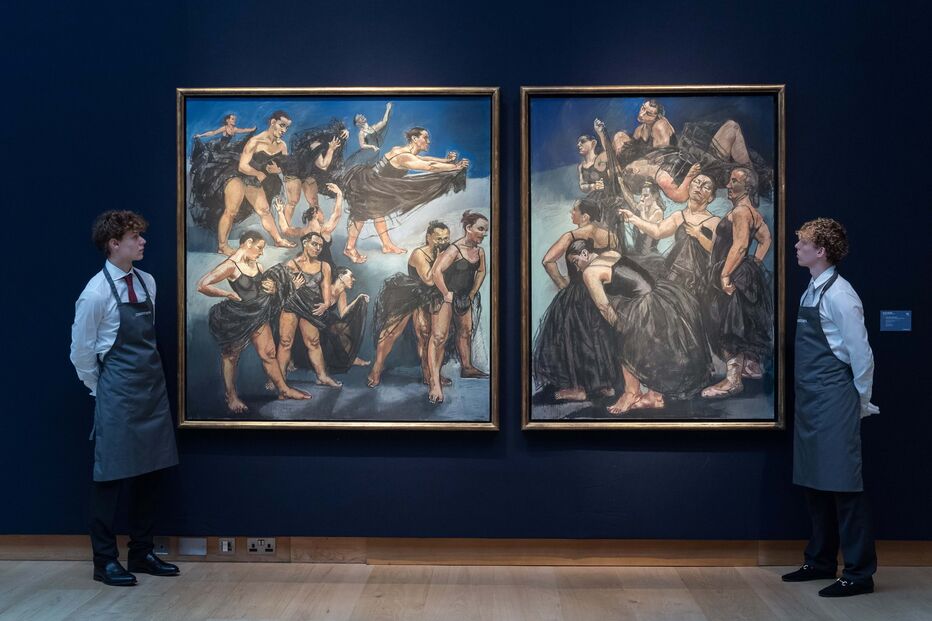Executada em dois painéis, a peça da artista com o título original "Dancing Ostriches from Walt Disney's 'Fantasia'", de 1995, vai pela primeira vez a leilão. Inspirada no filme do realizador norte-americano Walt Disney, a série "Avestruzes Bailarinas" fez anteriormente parte da Coleção Saatchi, criada para a exposição da Hayward Gallery "Spellbound: Art and Film", em 1996, e tem sido exibida frequentemente nas últimas três décadas.