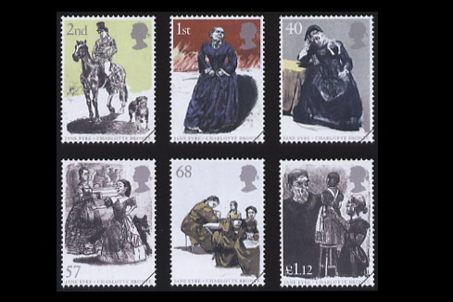 O selo de 2nd reproduz a litografia ‘Mr. Rochester’; ‘Vem a mim’ ilustra o selo de 1st; enquanto o quadro ‘No conforto da touca’ aparece no selo de 40. Por sua vez, o selo de 57 reproduz ‘School Room’; o selo de 68 apresenta o quadro ‘Refeitório’ e, por último, o selo de 1,12 £ apresenta a litografia com o título ‘Inspeção’.