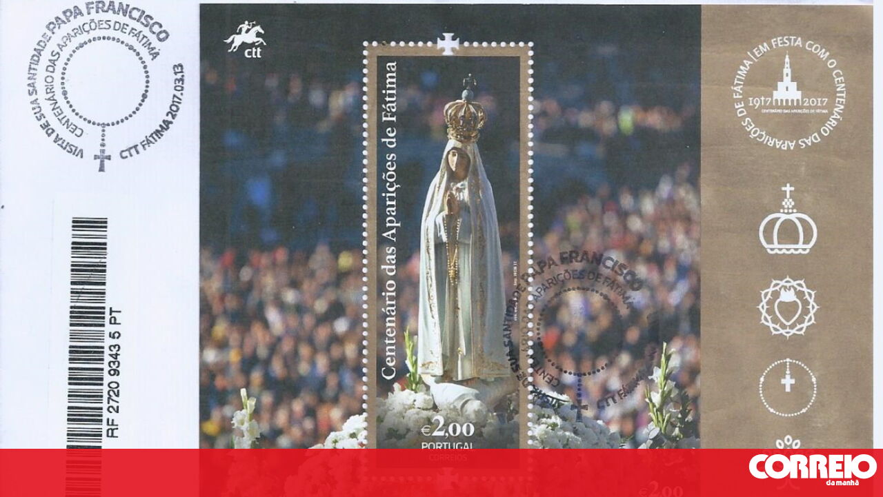 Na foto, reproduzimos uma carta registada com o bloco comemorativo do centenário das Aparições de Fátima e obliterada com o carimbo de primeiro dia de emissão de Fátima. A emissão foi lançada a 13 de março.