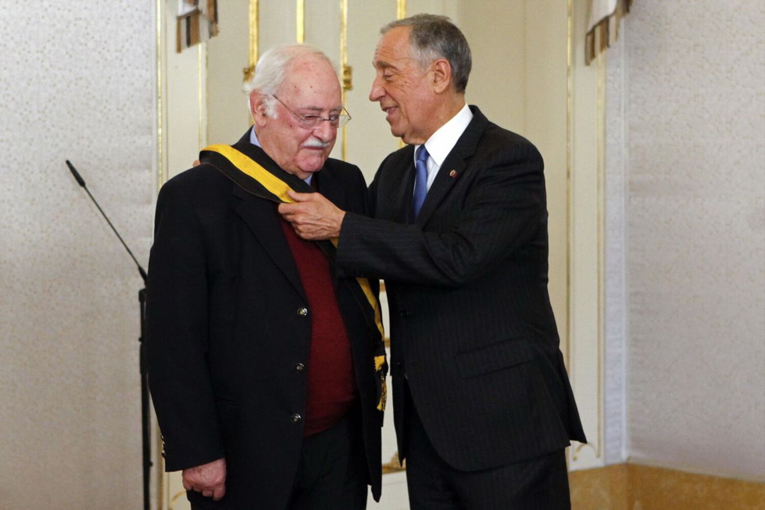 Depois do discurso, Marcelo Rebelo de Sousa impôs as insígnias a Ruy de Carvalho, que estava visivelmente emocionado.
