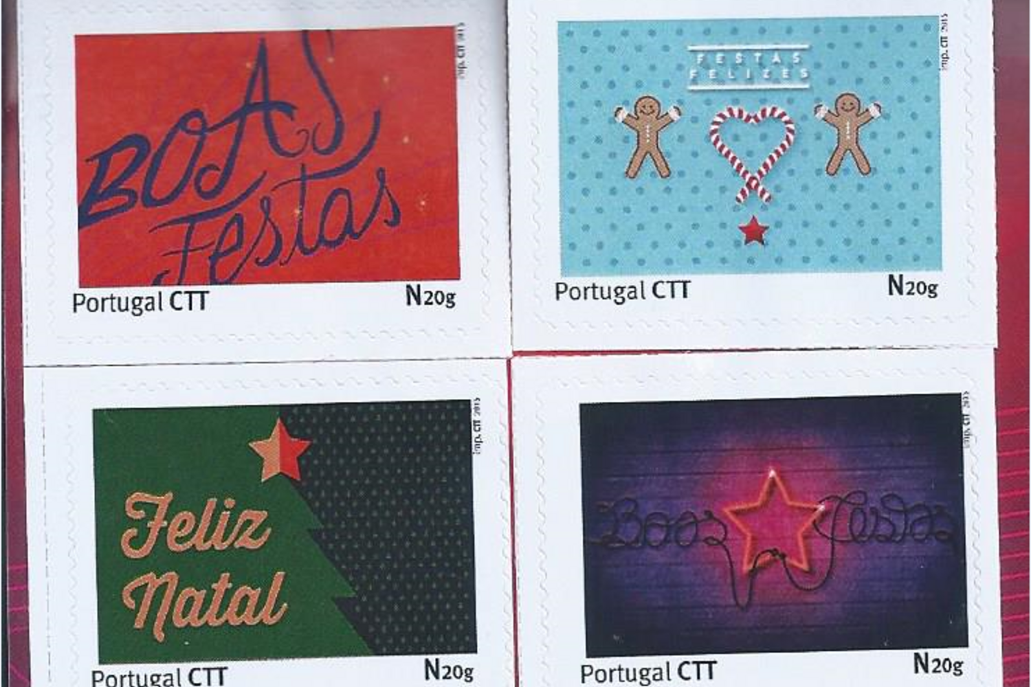 Os selos personalizados – com taxa N20g, porte para o correio doméstico – reproduzem os motivos dos postais de Natal.