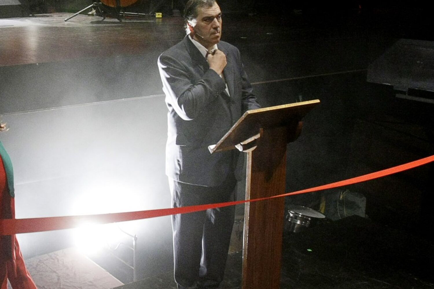 Ele entra em cena vindo das catacumbas do Teatro Municipal São Luiz, rodeado por fumo. Ao seu lado, duas jovens muito belas sorriem enquanto lhes apalpa o rabo. Depois faz um discurso onde garante que Portugal "é um país rico" que "não deve dinheiro a ninguém". Quem é ele?