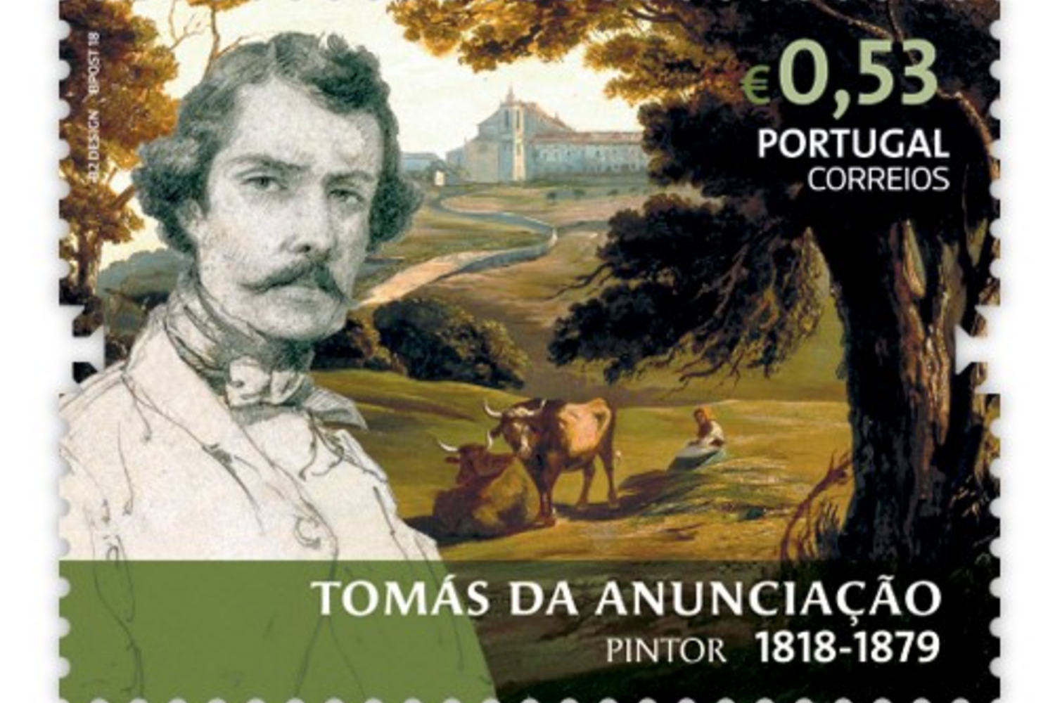 O pintor Tomás da Anunciação é reproduzido num selo da série, bem como o óleo sobre tela da sua autoria que leva o título ‘Vista da Penha de França’ pertencente ao acervo do Museu do Chiado.